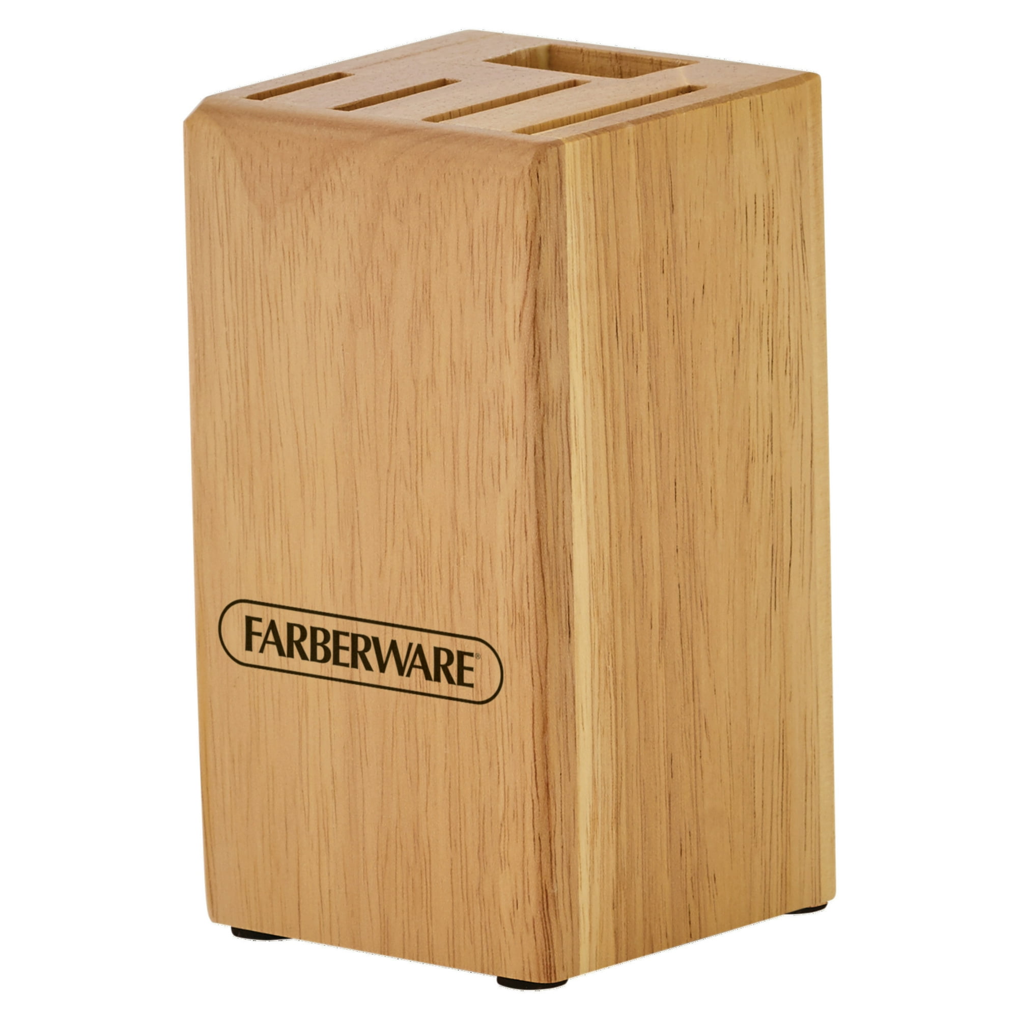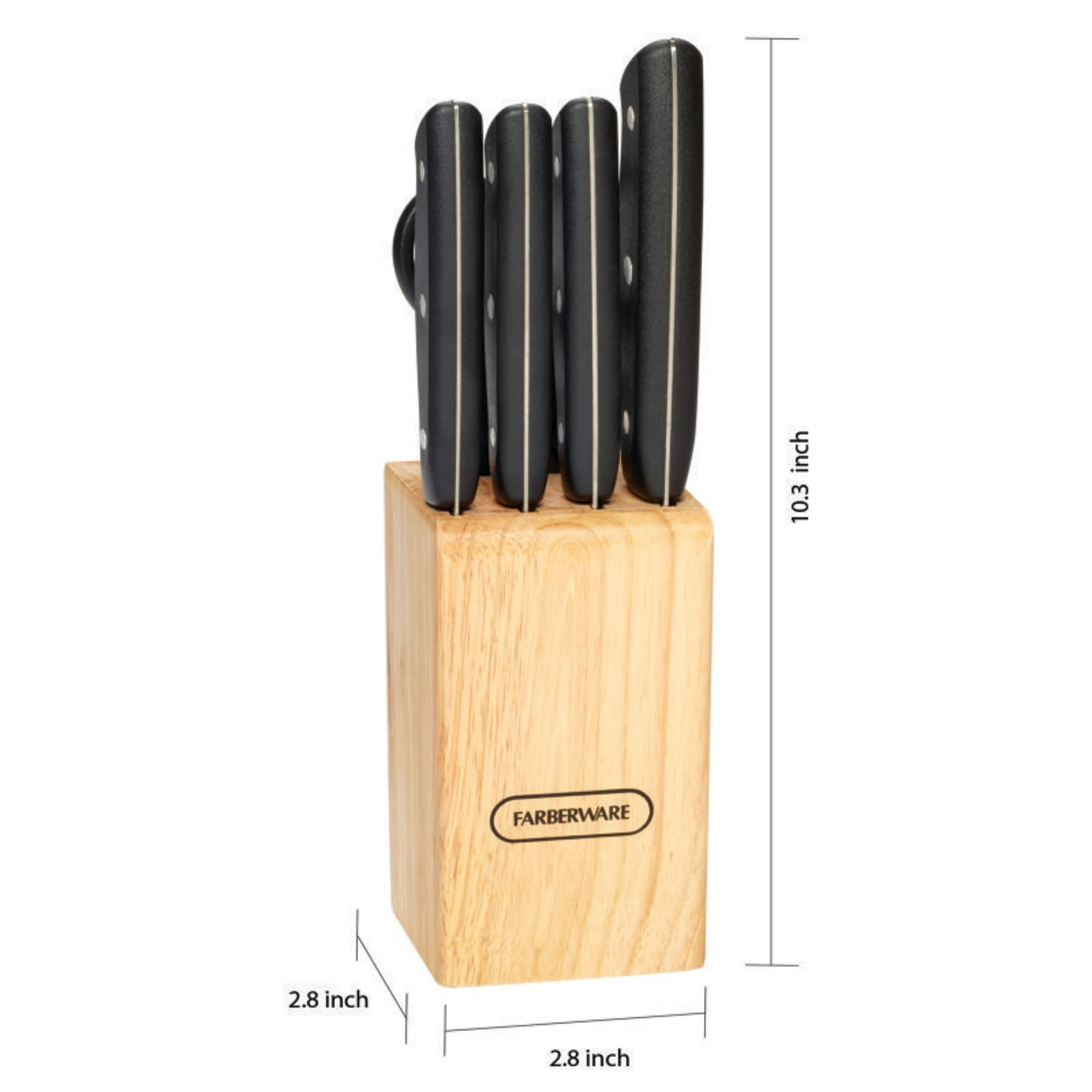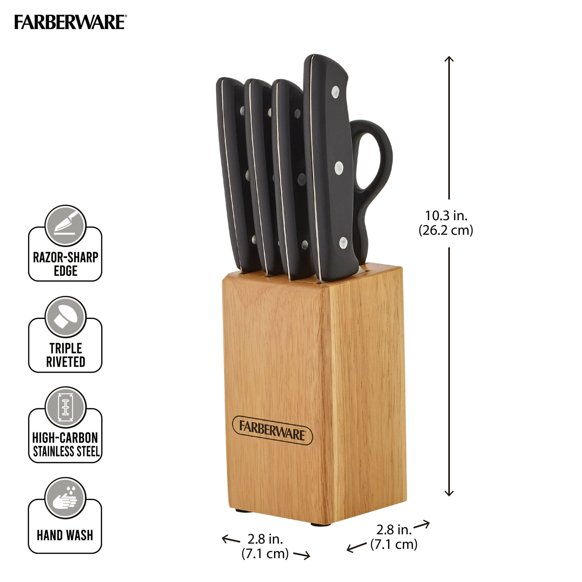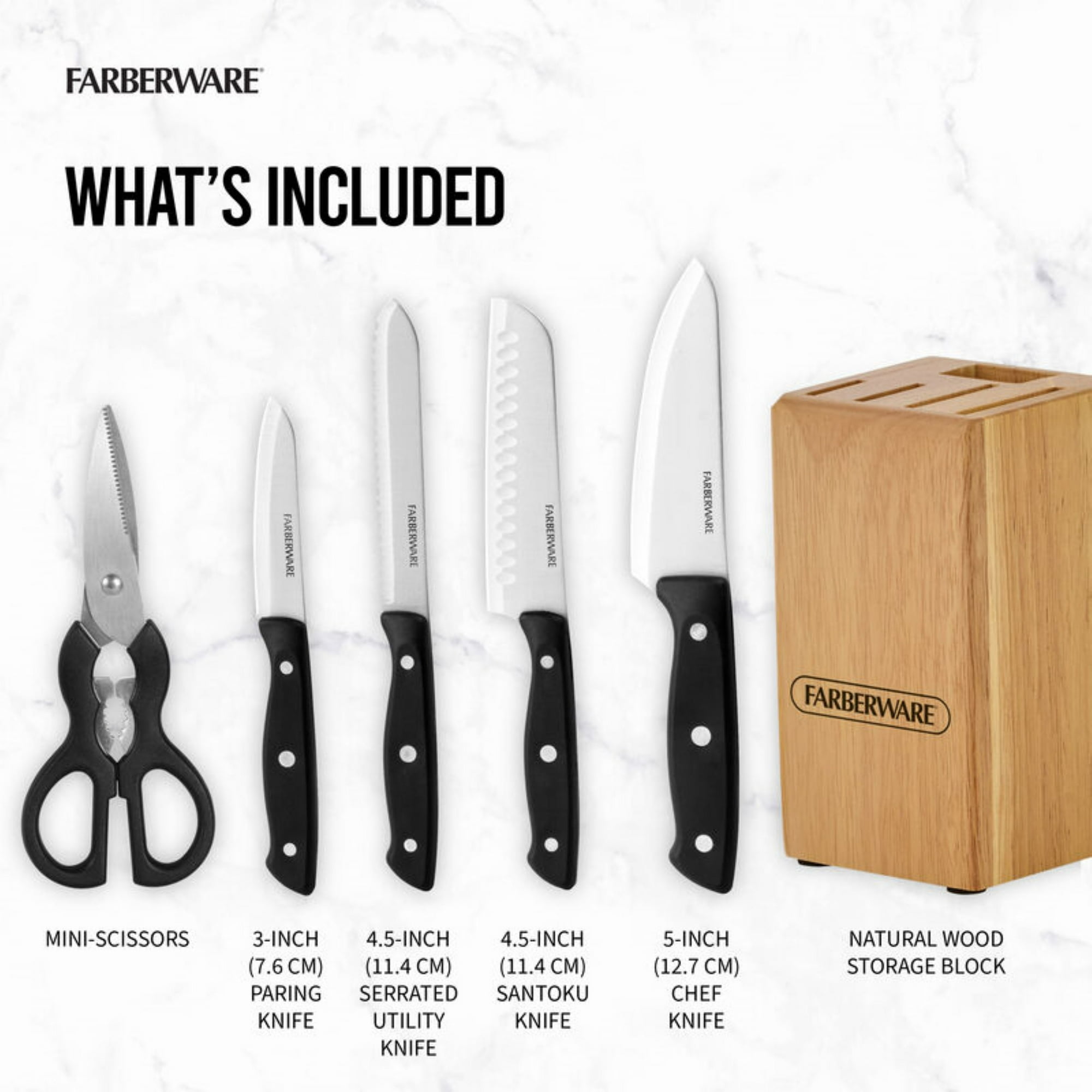 The Farberware Traditions 6-Piece Prep Set keeps essential knives for simple food preparation right at your fingertips. Each knife features high-carbon stainless steel blades that are perfectly weighted and balanced for optimal control while cutting. This set includes a 3-inch paring knife, a 5-inch utility knife, a 5-inch chef knife, a 5-inch Santoku knife, all-purpose scissors, and a natural wood storage block. Please note that this knife set is not dishwasher safe; hand wash with warm water and mild detergent, rinsing and drying immediately.