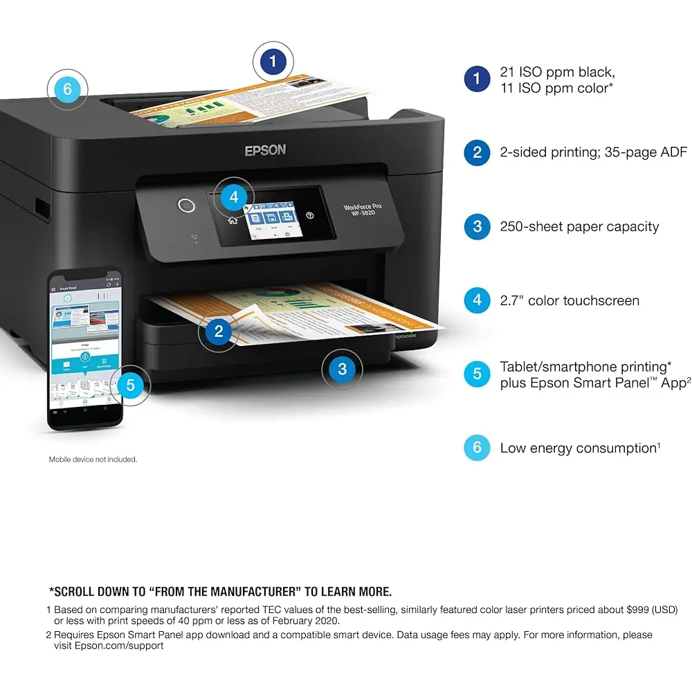 Boost productivity with the ultra-efficient WorkForce Pro WF-3820 all-in-one printer, designed for high-volume environments. This printer delivers precise, professional-quality prints at speeds of up to 21 (black) / 11 (color) ISO ppm using vibrant DURABrite Ultra instant-dry pigment inks. Powered by Epson’s PrecisionCore Heat-Free Technology, it offers enhanced reliability with minimal downtime. Featuring a 250-sheet paper capacity, auto 2-sided printing, built-in wireless, and a 2.7" color touchscreen for easy control, the WF-3820 is ideal for small workgroups. Please note, it is compatible only with genuine Epson-brand cartridges.
