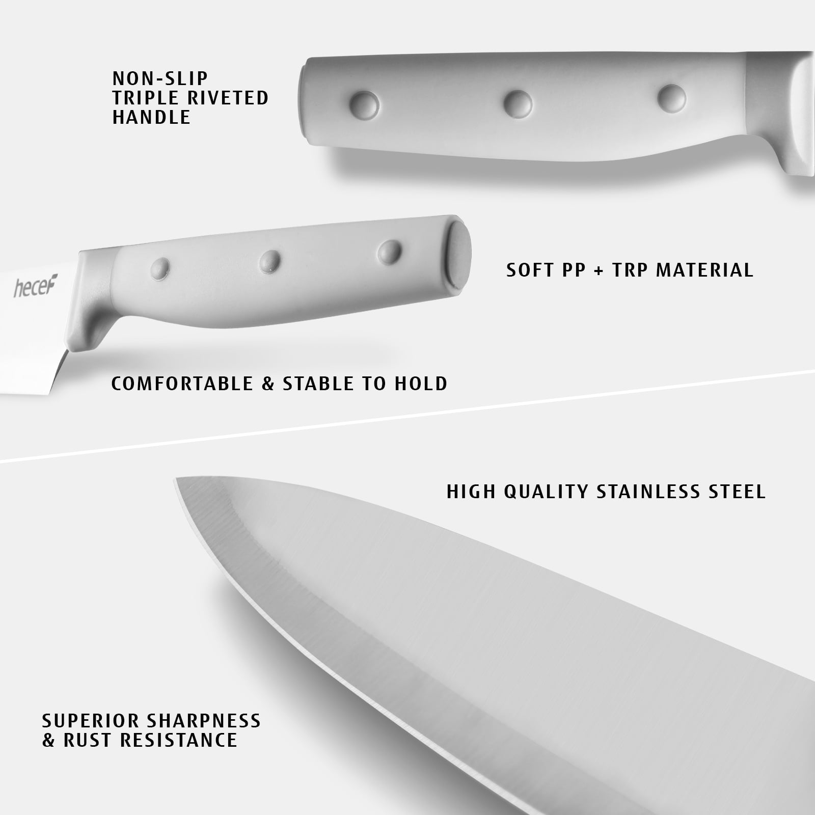 The triple-riveted handle is made from food-grade PP and TPR materials, providing a soft, non-slip, ergonomic grip for ultimate comfort during use.