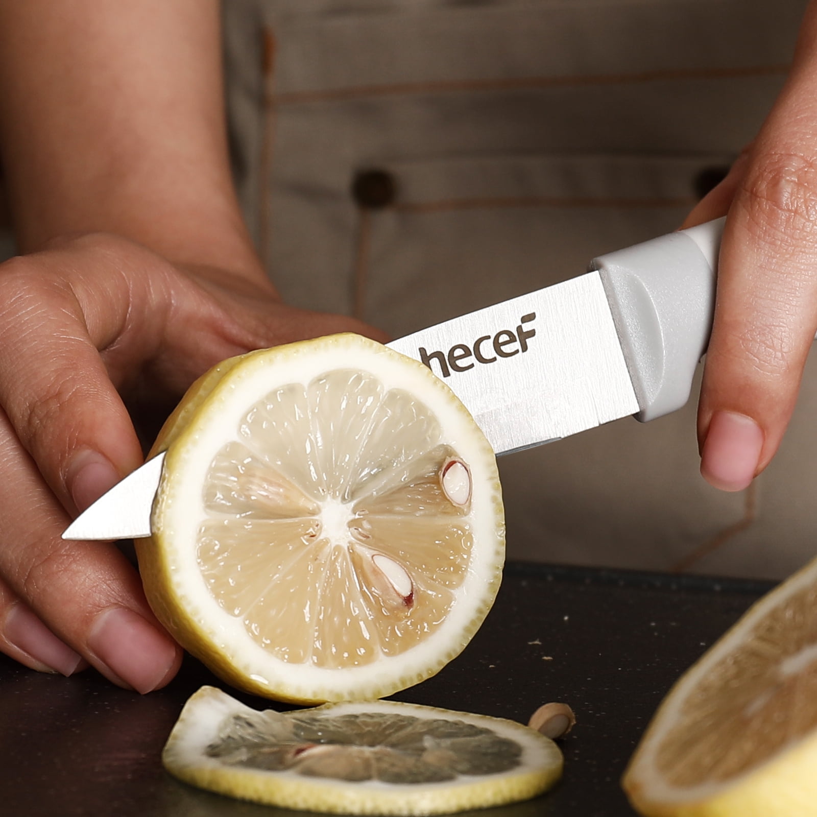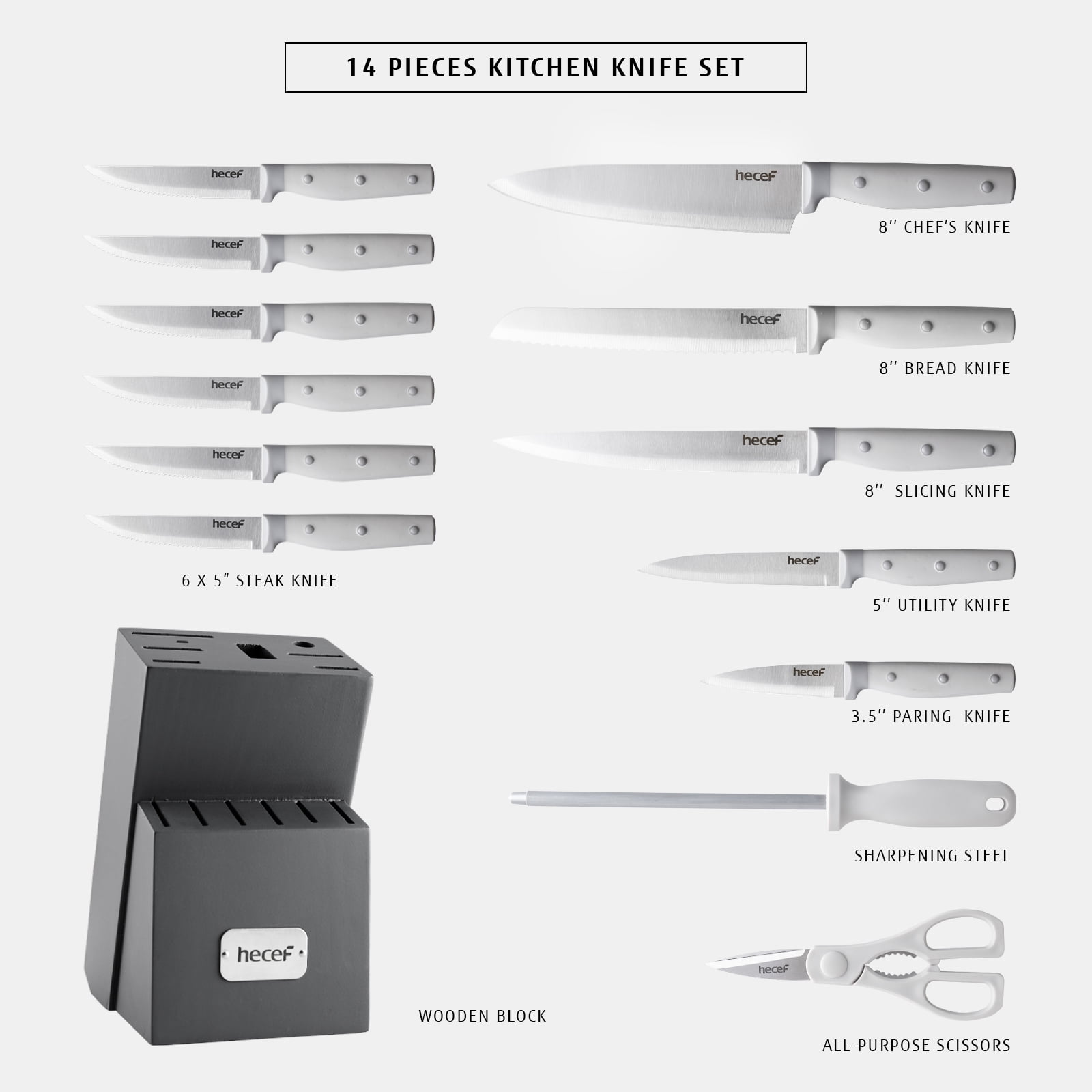 Still searching for the perfect gift for your loved ones? This hecef professional 14-piece high carbon stainless steel kitchen knife set is an excellent choice. It’s not only visually stunning but also incredibly sharp, featuring all the essential cutting tools: chef’s knife, bread knife, slicing knife, utility knife, six serrated steak knives, paring knife, all-purpose scissors, sharpening steel, and a wooden block.