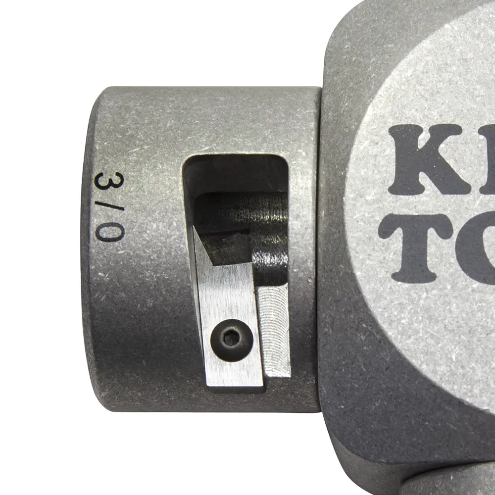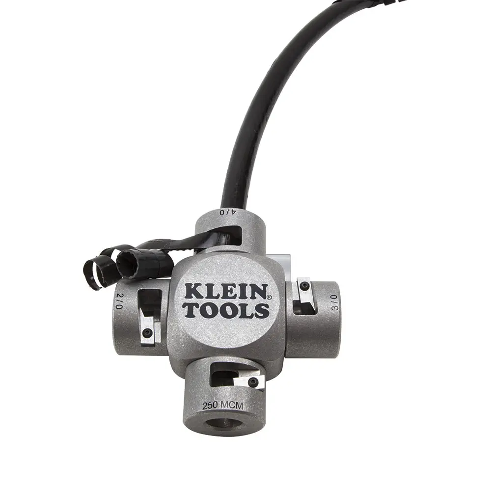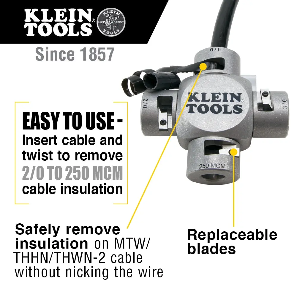 Klein's Large Cable Stripper is designed to safely remove insulation from MTW, THHN, and THWN-2 cables without damaging the wire. Simply insert the cable and twist for clean, precise cuts. The clover design includes four sizes, ranging from 250 MCM to 2/0, all in one tool. It offers a safer, easier, and more accurate alternative to using a utility knife.
