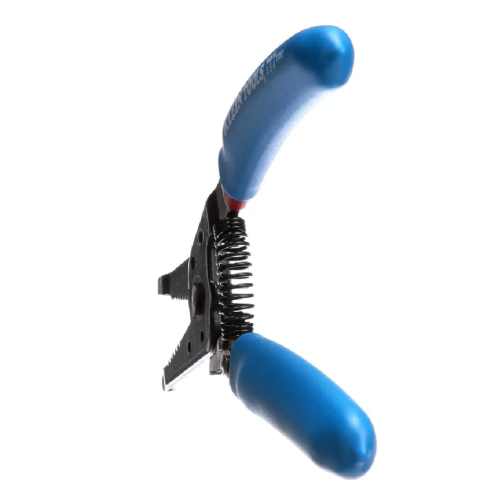 Klein's Wire Stripper/Cutter is designed with a coil spring for quick, self-opening action. The serrated nose provides a strong grip, making it easy to bend, shape, and pull wire. This tool features precision-ground stripping holes and screw-shearing holes. It is suitable for use with 20-30 AWG solid and 22-32 AWG stranded wire.
