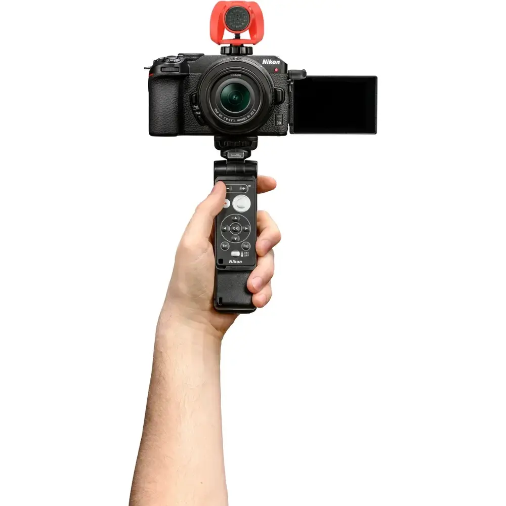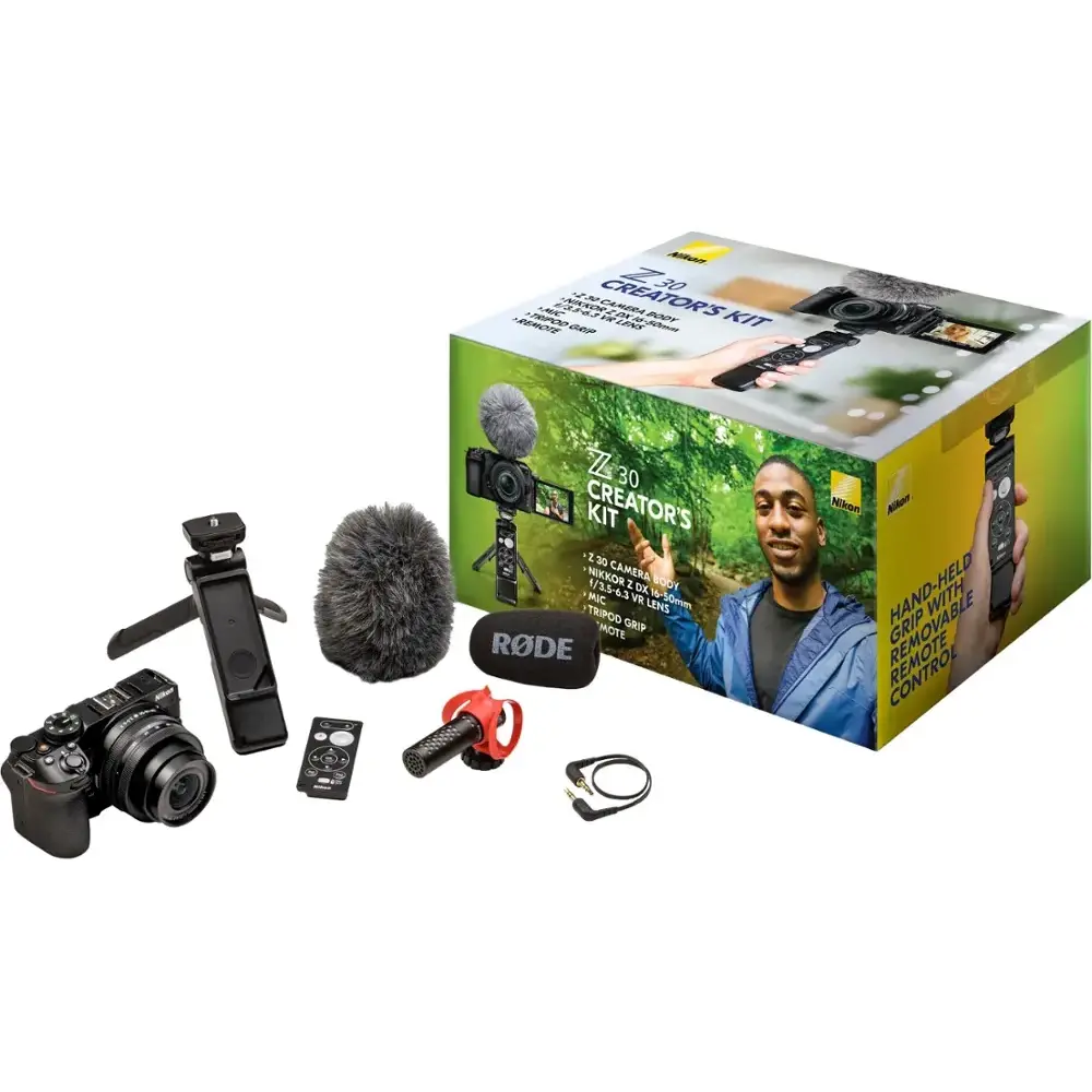 The Z 30 Creator's Kit includes the compact and lightweight Z 30 camera, paired with the NIKKOR Z DX 16-50mm f/3.5-6.3 VR lens. This versatile zoom lens features built-in Vibration Reduction for stabilized images and quiet operation, making it ideal for video. The kit also comes with the Nikon ML-L7 Bluetooth Remote Control, a RODE VideoMicro Microphone II, and a SmallRig Tripod Grip designed to hold the ML-L7.