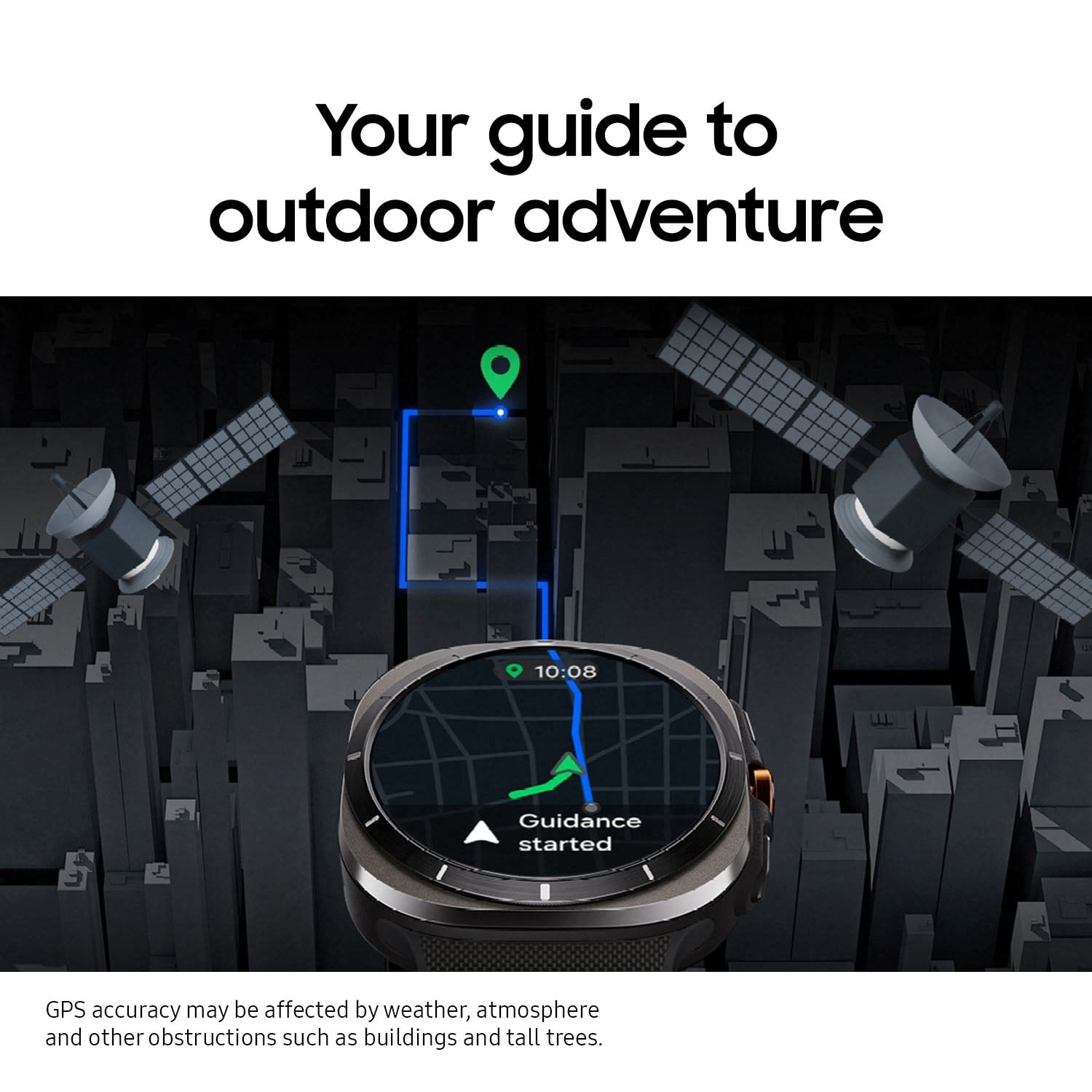 Gear up for adventure with the Galaxy Watch Ultra our most rugged and feature packed smartwatch yet. Built for top performance, this durable titanium watch withstands intense workouts and outdoor conditions.Key features include:Durable Design: Tough titanium construction, built to handle your toughest workouts.Performance Tracking: Galaxy AI compares your current performance with past data to help you improve.Daily Insights: Start strong with a physical readiness score based on your sleep, heart rate, and activity.Enhanced Heart Rate Tracking: Accurate readings for optimized workouts, filtered for movement.Personalized Tips: Get daily wellness suggestions tailored to your needs.Long Battery Life: Up to 100 hours of use on a single charge, perfect for extended activities.Quick Controls: Easily start, pause, and end workouts with a customizable Quick Button.Stay Connected: Handle calls and texts right from your wrist with LTE connectivity.Improved GPS: Turn-by-turn navigation helps you stay on track during outdoor activities.Better Sleep Tracking: Enhanced sleep tracker with features to detect sleep apnea.Ready for anything and built to last, the Galaxy Watch Ultra is your ultimate adventure companion.