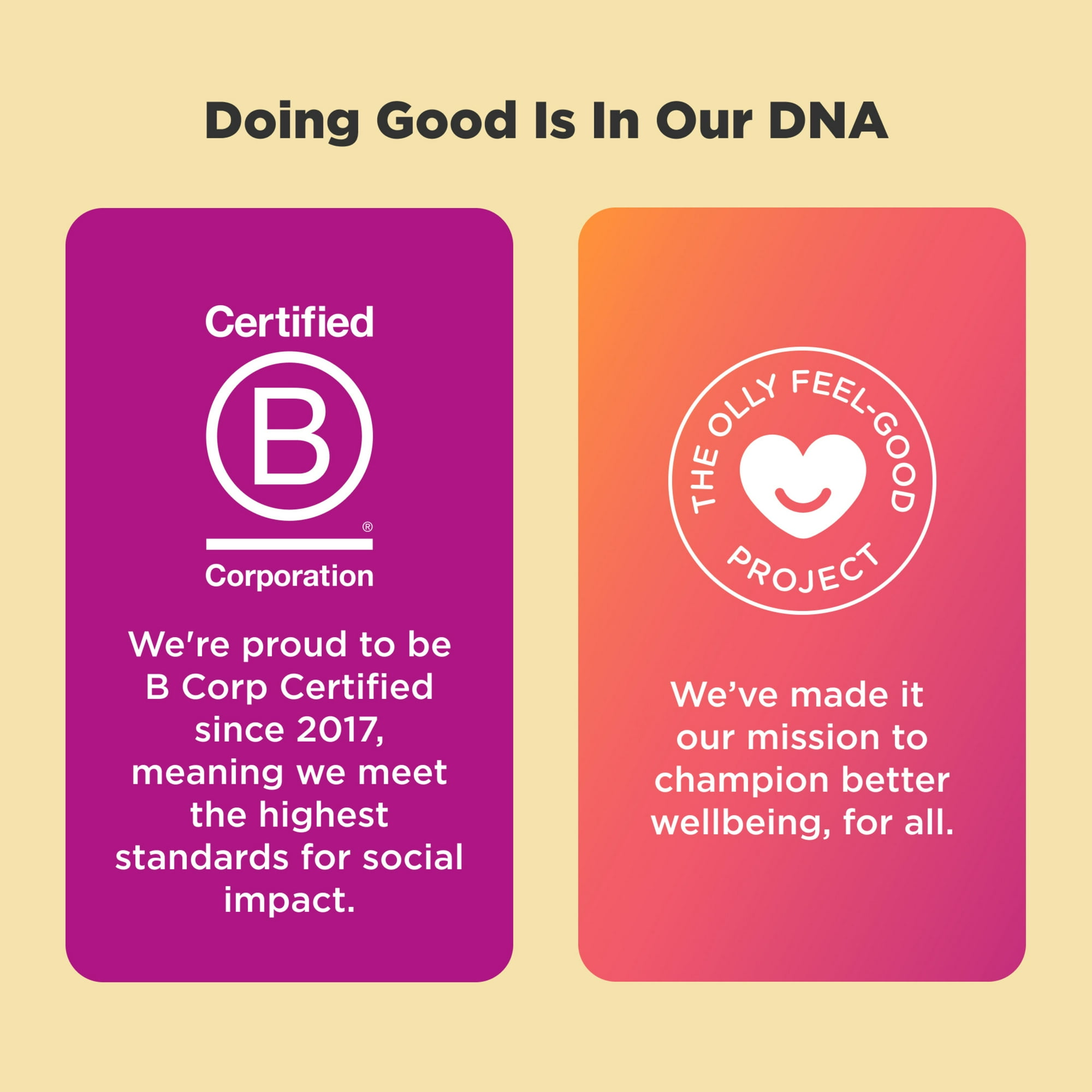 At OLLY, wellness is central to our mission. We are dedicated to making nutrition straightforward so you can achieve good health without compromise. We achieve this by crafting products that are both effective and delightful because we believe that when something feels good, you’re more inclined to incorporate it into your routine.