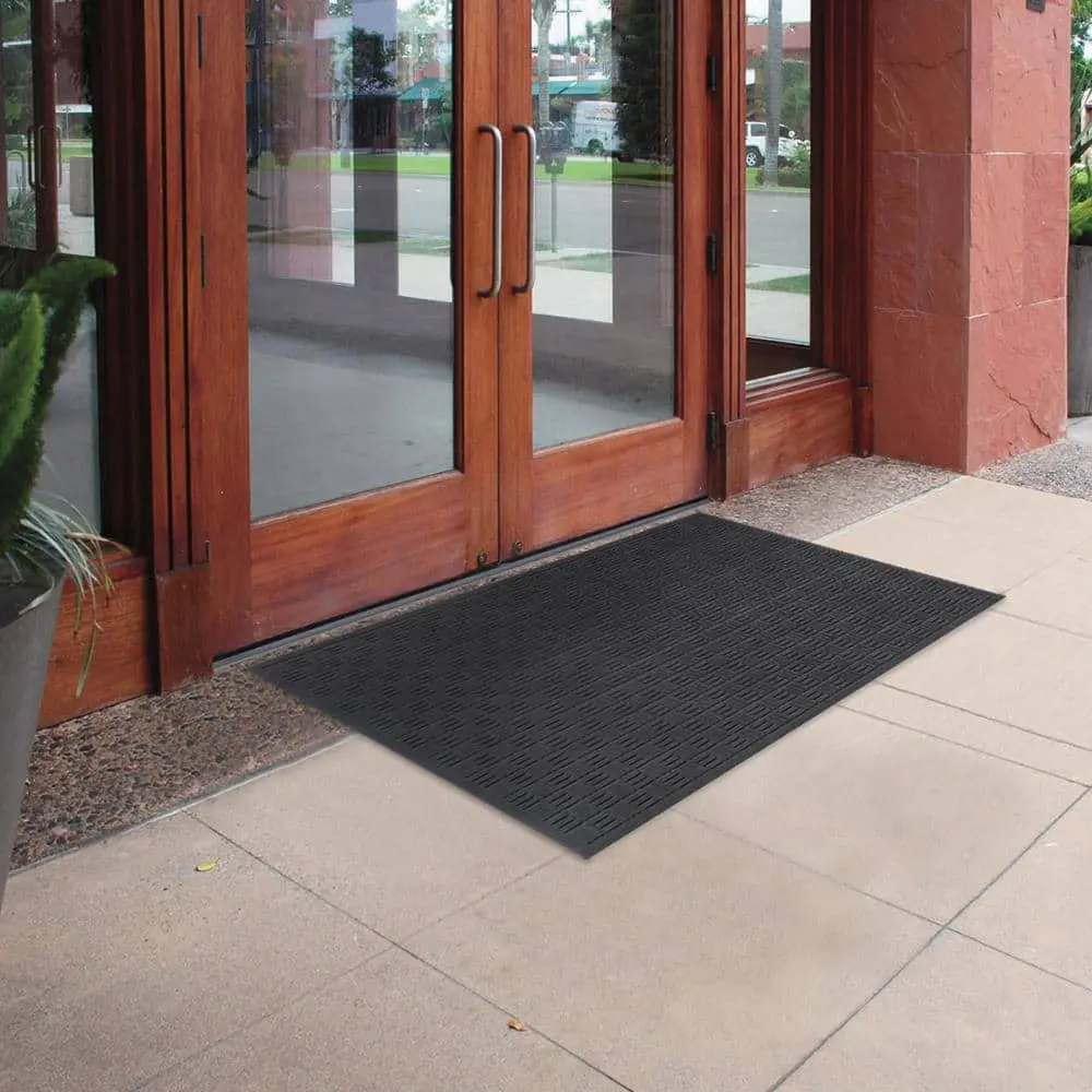 The 24 in. x 36 in. Black Recycled Rubber Commercial Door Mat combines durability with eco-friendliness, made from recycled rubber for a sustainable option. The classic black color seamlessly blends into any environment, while its design effectively traps dirt and debris, keeping your floors clean. The non-slip backing ensures the mat stays securely in place, offering stability and safety. Easy to maintain, it can be shaken or rinsed clean, making it a practical, eco-conscious choice for high-traffic areas