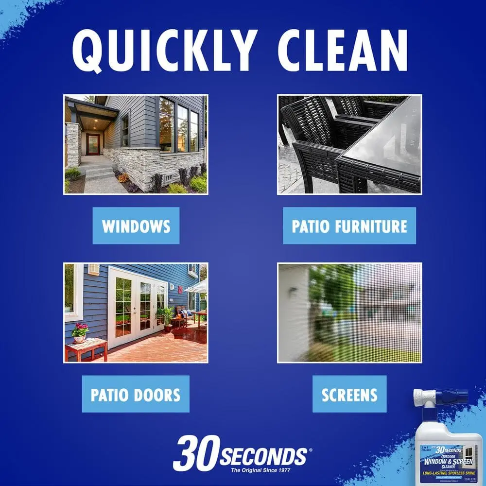 30 Seconds Outdoor Window & Screen Cleaner effortlessly cleans windows, screens, and glass while leaving a long-lasting shine. Just attach the bottle to your garden hose and follow the instructions for easy use. The fast-acting formula sprays directly onto glass or screens, so there's no need to remove them, simplifying your outdoor cleaning. With a reach of up to 24+ feet, you can clean high windows without the hassle of a ladder!