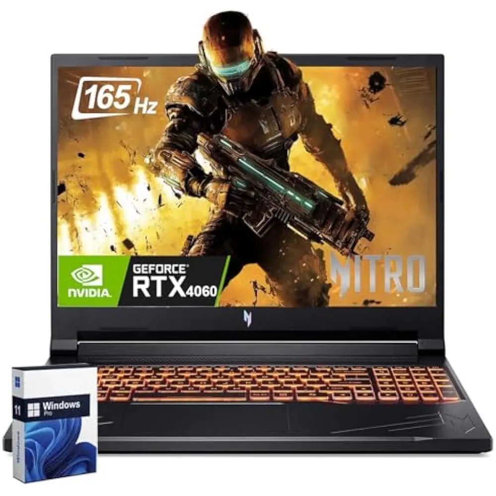 The Acer Nitro 16 Gaming Laptop features an AMD Ryzen 7 8845HS processor with 8 cores and speeds up to 5.1GHz, paired with NVIDIA GeForce RTX 4060 graphics with G-SYNC and 16GB-32GB GDDR6 VRAM for top-tier performance. Its 16-inch display offers a 1920 x 1200 resolution and a 165Hz refresh rate, ensuring smooth visuals. With up to 64GB of LPDDR5 RAM and a 2TB SSD, this laptop provides ample memory and storage for demanding tasks and multitasking. Running on Windows 11 Pro, it includes advanced connectivity options such as Wi-Fi 6, Bluetooth, HDMI, RJ-45, and a headphone/mic combo jack with 2x2 MU-MIMO support. Designed in Obsidian Black, the laptop also has a backlit keyboard with a numeric keypad. At just 5.95 pounds and measuring 14.18 x 11.02 x 1.1 inches, it delivers both power and portability for gaming and productivity.