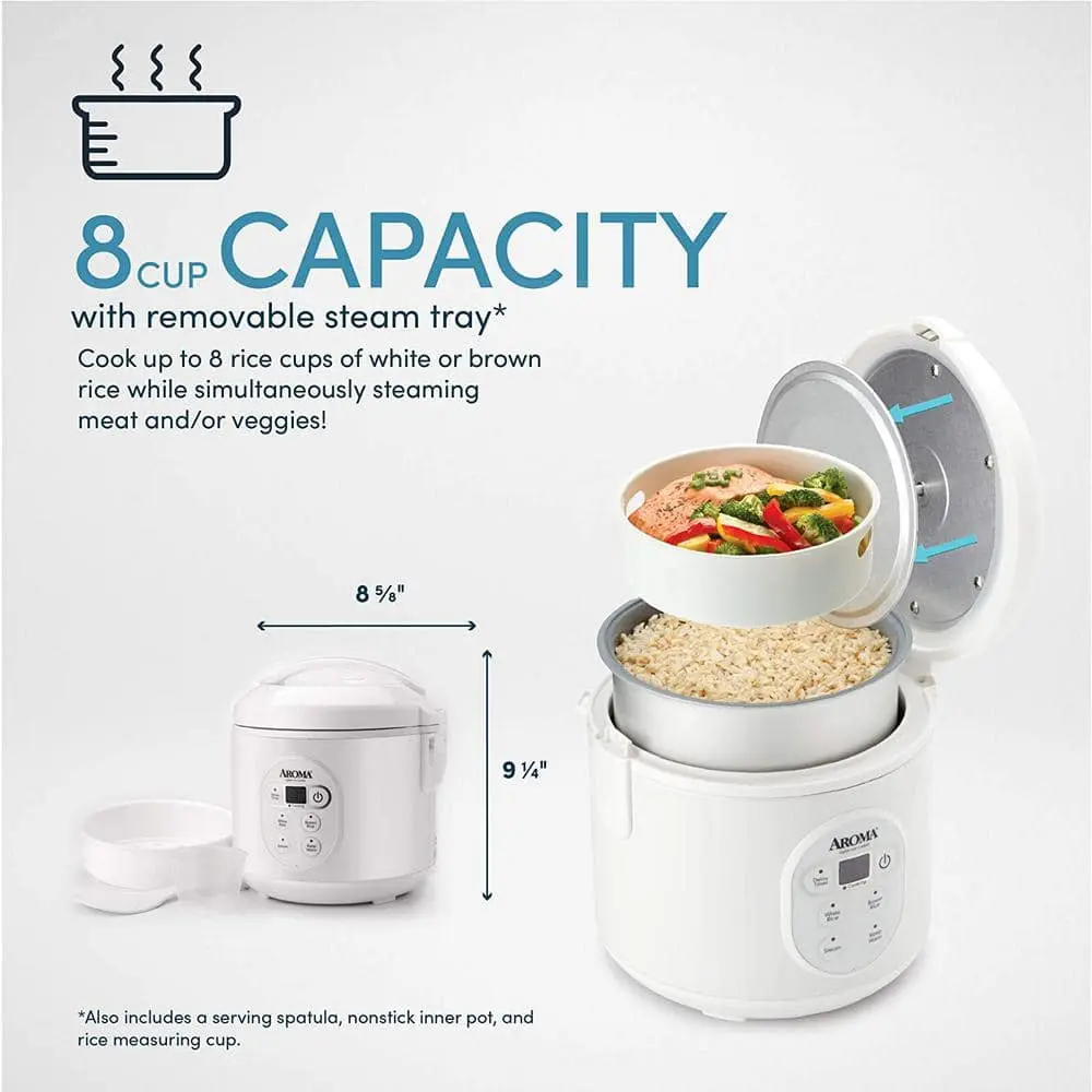 Cooks 2 to 8 cups of any type of rice to perfection.Steams meat and vegetables simultaneously while cooking rice below.User-friendly, programmable digital controls with automatic keep-warm and options for white and brown rice.Ideal for soups, jambalaya, chili, and a variety of other dishes.Features a 15-hour delay timer for flexible meal scheduling.Comes with a steaming tray, rice measuring cup, and serving spatula.