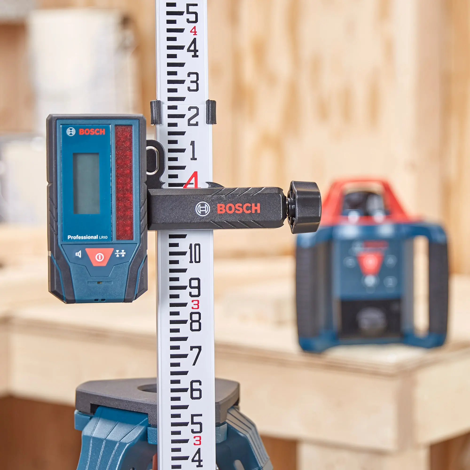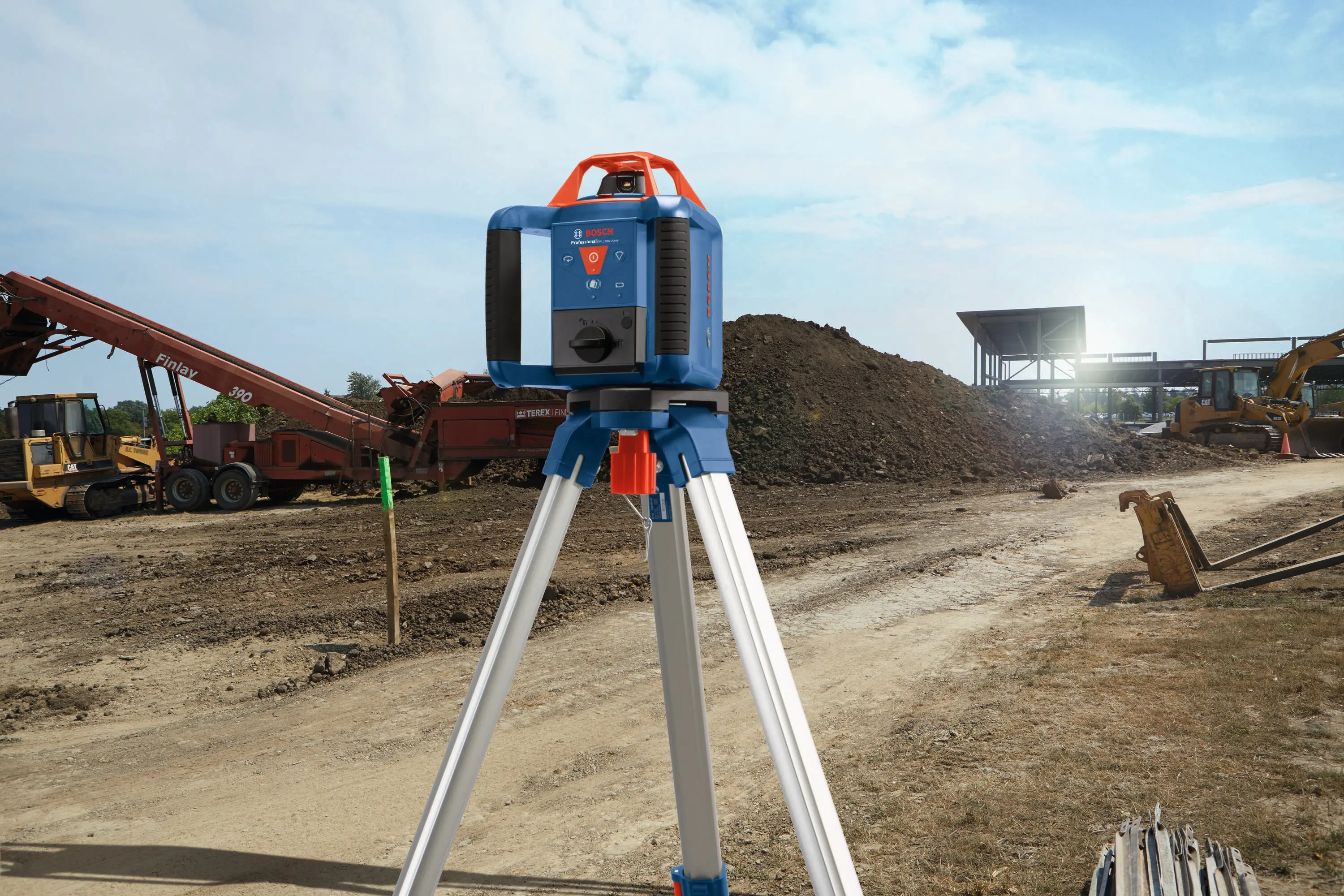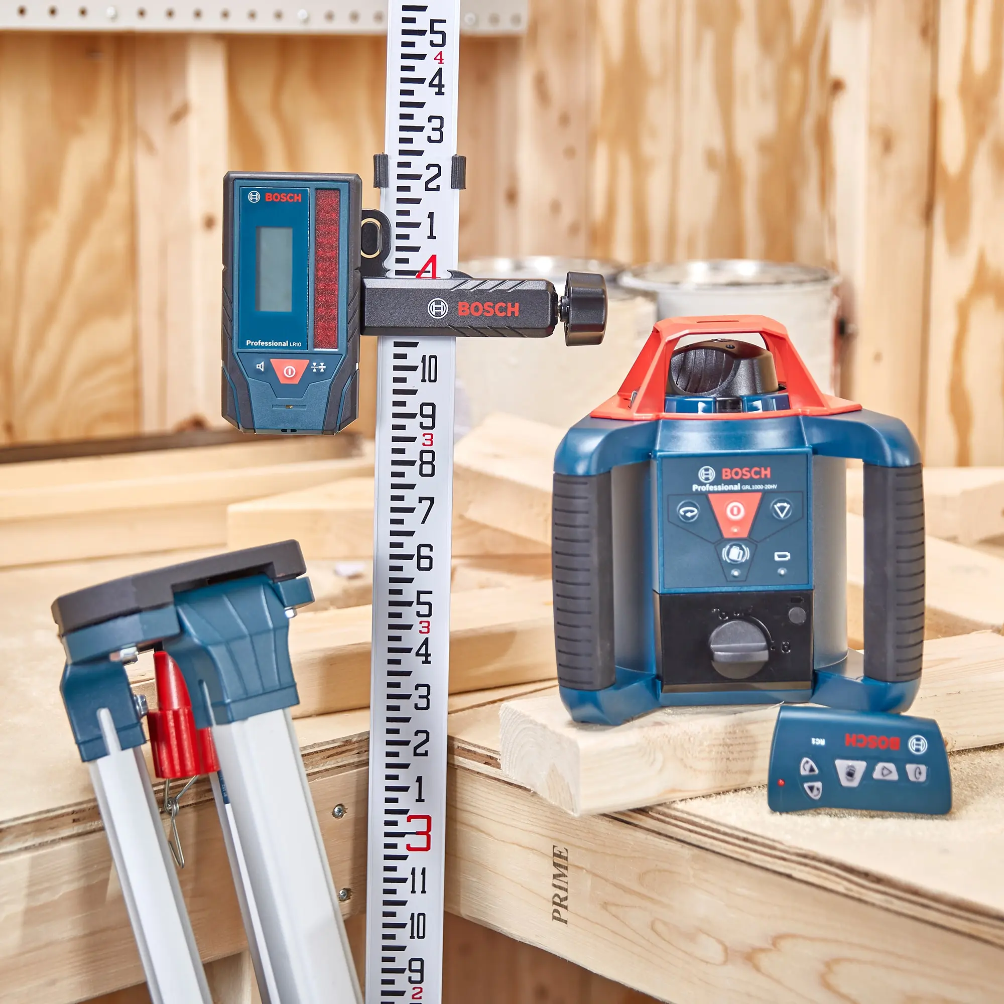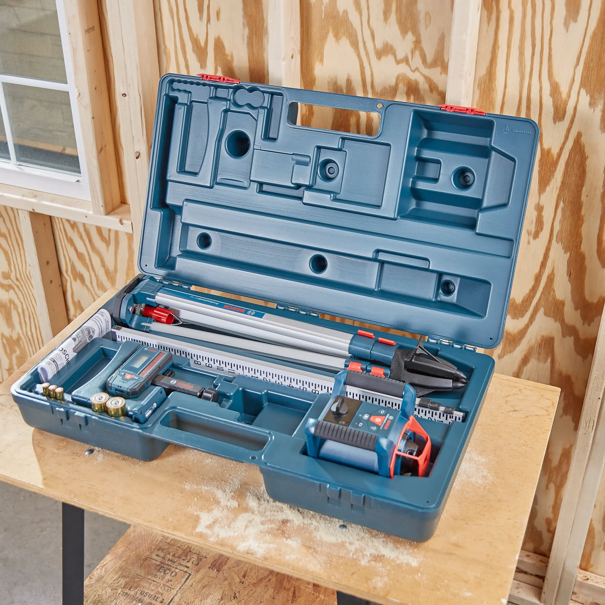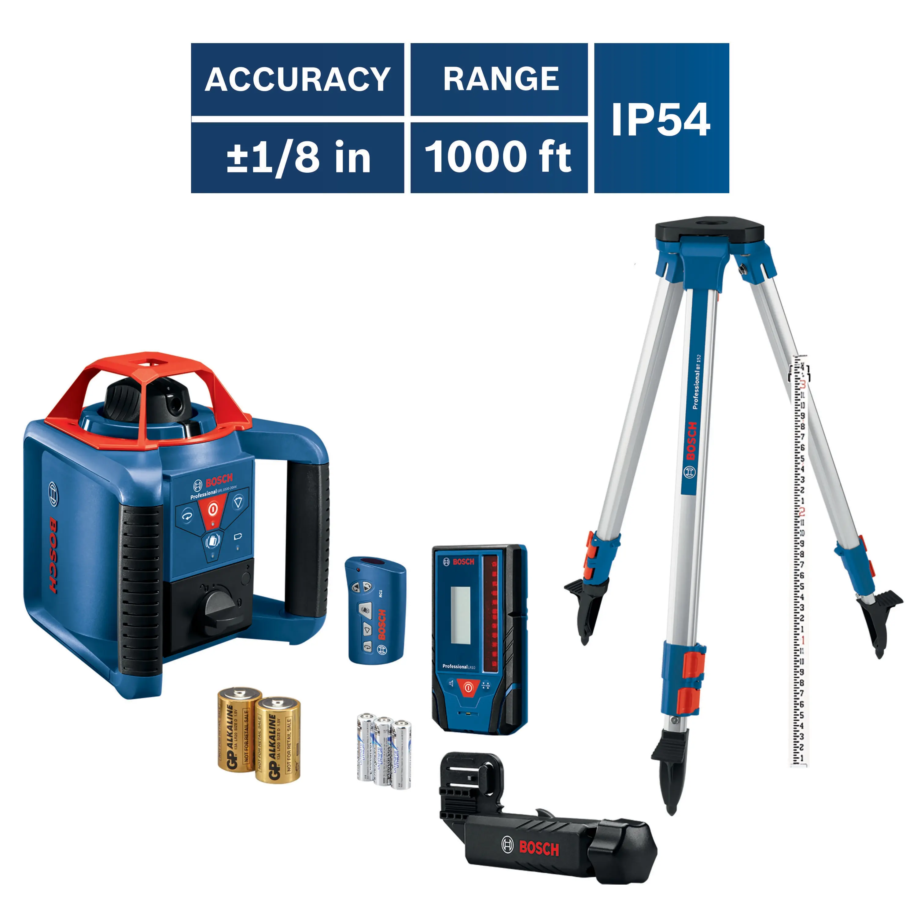The Bosch GRL1000-20HVK Self-Leveling Rotary Laser Kit offers a complete solution for precise indoor and outdoor leveling. With horizontal and vertical self-leveling capabilities, its ideal for leveling, aligning, and squaring applications. This durable laser features variable speed and manual scan angles for optimal visibility in varying lighting conditions, delivering accuracy of 1/8 inch at 100 feet and a range of up to 1,000 feet with the LR10 receiver. Its electronic self-leveling system includes a disturbance monitor to maintain consistent accuracy. The kit is user-friendly, with a remote control for one-person operation, and comes with a laser receiver, aluminum tripod, grade rod, and hard carrying case, making it a robust all-in-one solution for any jobsite.