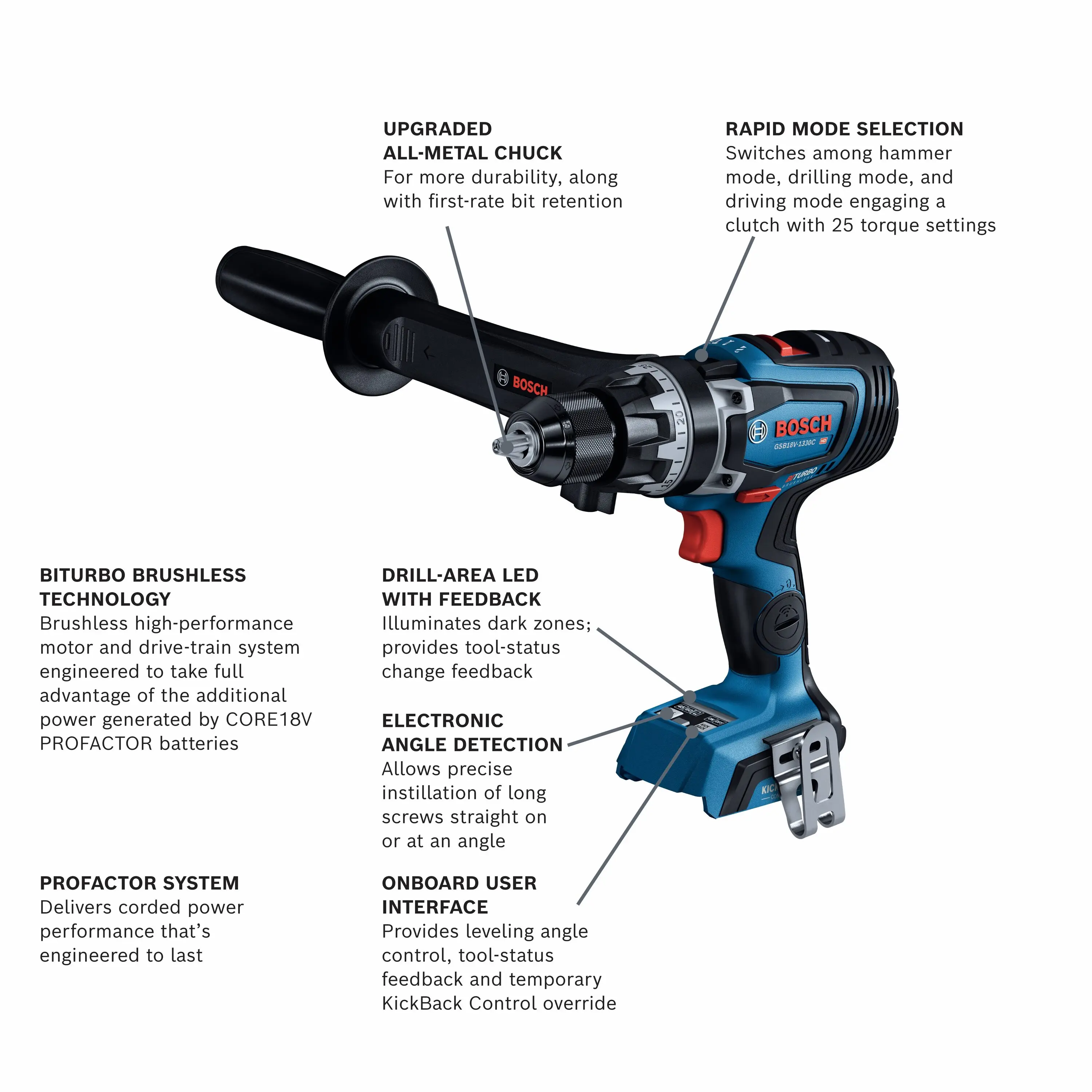 This Bosch 18V PROFACTOR Hammer Drill/Driver is designed for tough drilling and driving tasks, particularly for creating large holes with precision. The GSB18V-1330C features BITURBO Brushless Technology, which pairs with the CORE18V High Power Battery to deliver performance comparable to high-demand corded tools. With a powerful brushless motor, it offers up to 1,330 In-Lbs of max torque.The drill has variable speed settings, including high speed (0-2,200 RPM) and high power (0-550 RPM), along with 25 clutch settings to minimize fastener damage. Safety features include KickBack Control to reduce injury risk during bind-up situations and Electronic Angle Detection for accurate drilling angles. The all-metal chuck enhances durability, and the longer belt clip provides a more secure hold. This tool is part of the Connected-Ready series, making it a versatile choice for professionals.