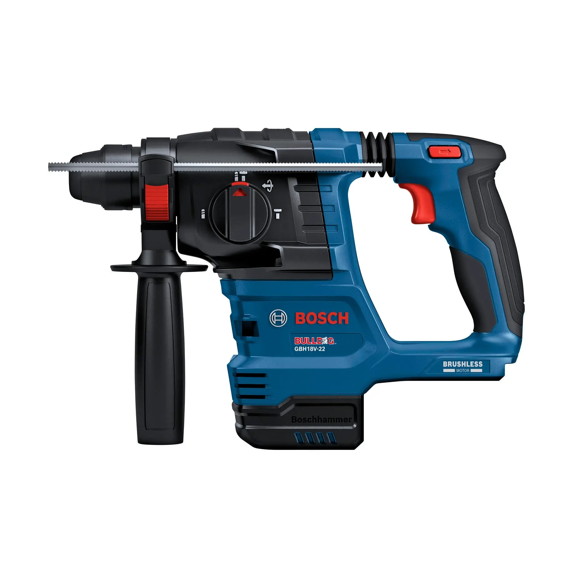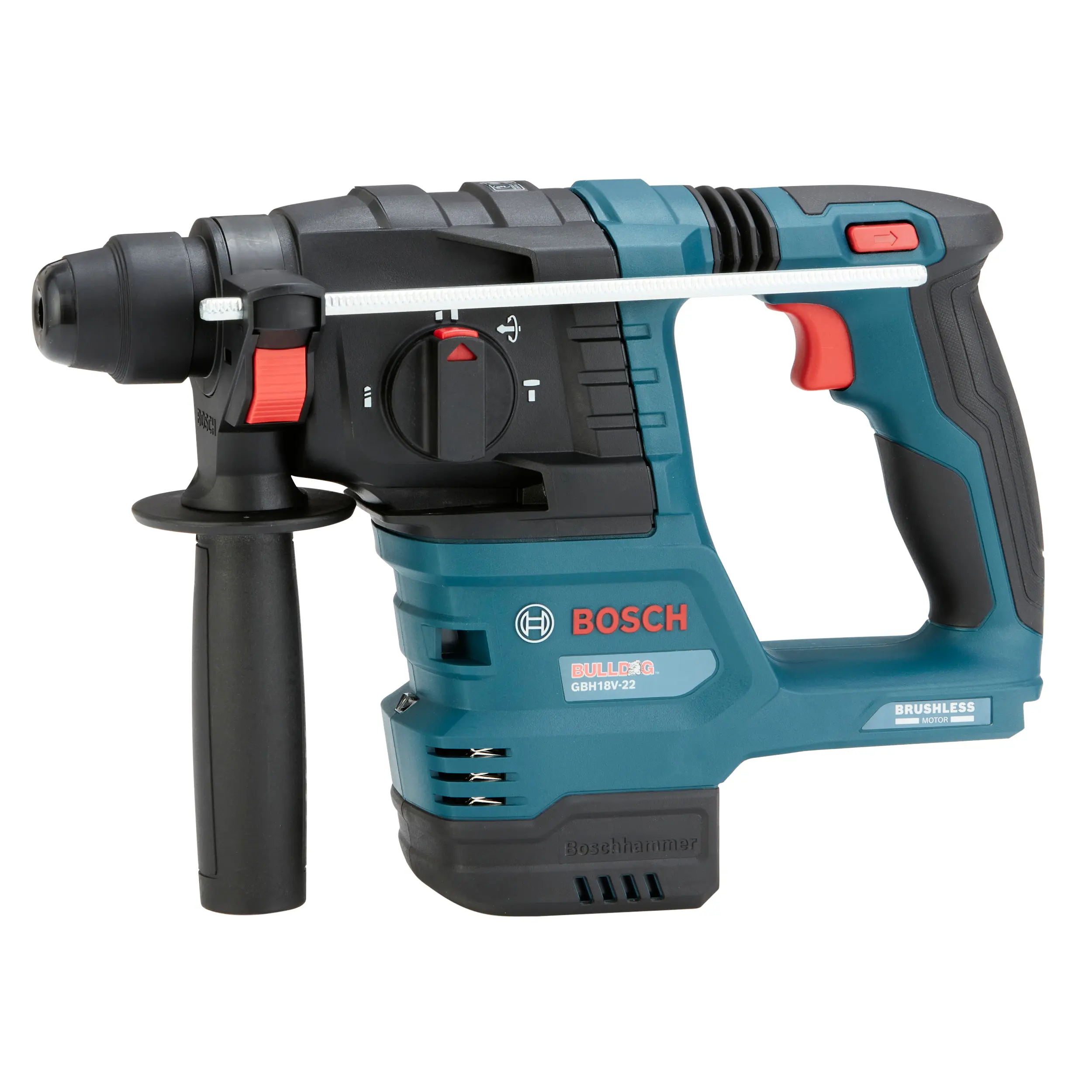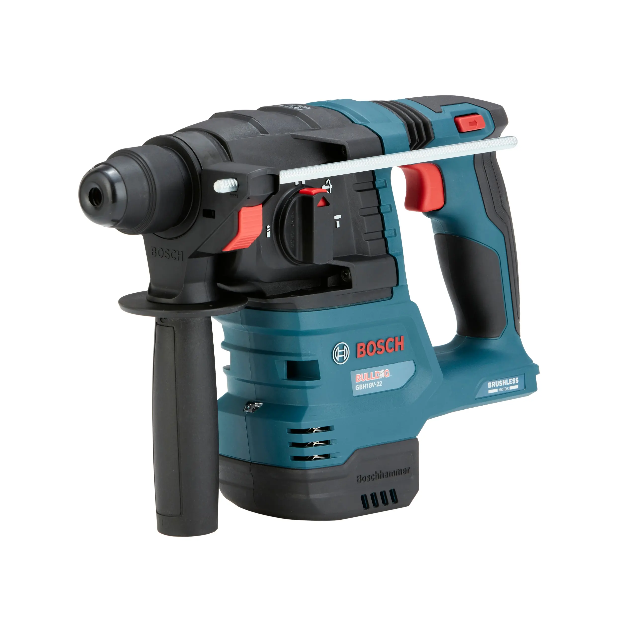 The Bosch GBH18V-22N 18V Brushless 3/4-Inch SDS-plus Bulldog Rotary Hammer is a powerful yet manageable tool designed for exceptional performance. It features KickBack Control to reduce sudden reactions in binding conditions and an anti-vibration system for user comfort during extended use. Its L-shaped design enhances control for overhead and tight-space drilling. The brushless motor maximizes battery runtime, while the 360-degree side handle provides multiple grip positions. With Vario-Lock positioning for optimal angles, it offers three operation modes: rotary hammer, rotation only, and hammer only.