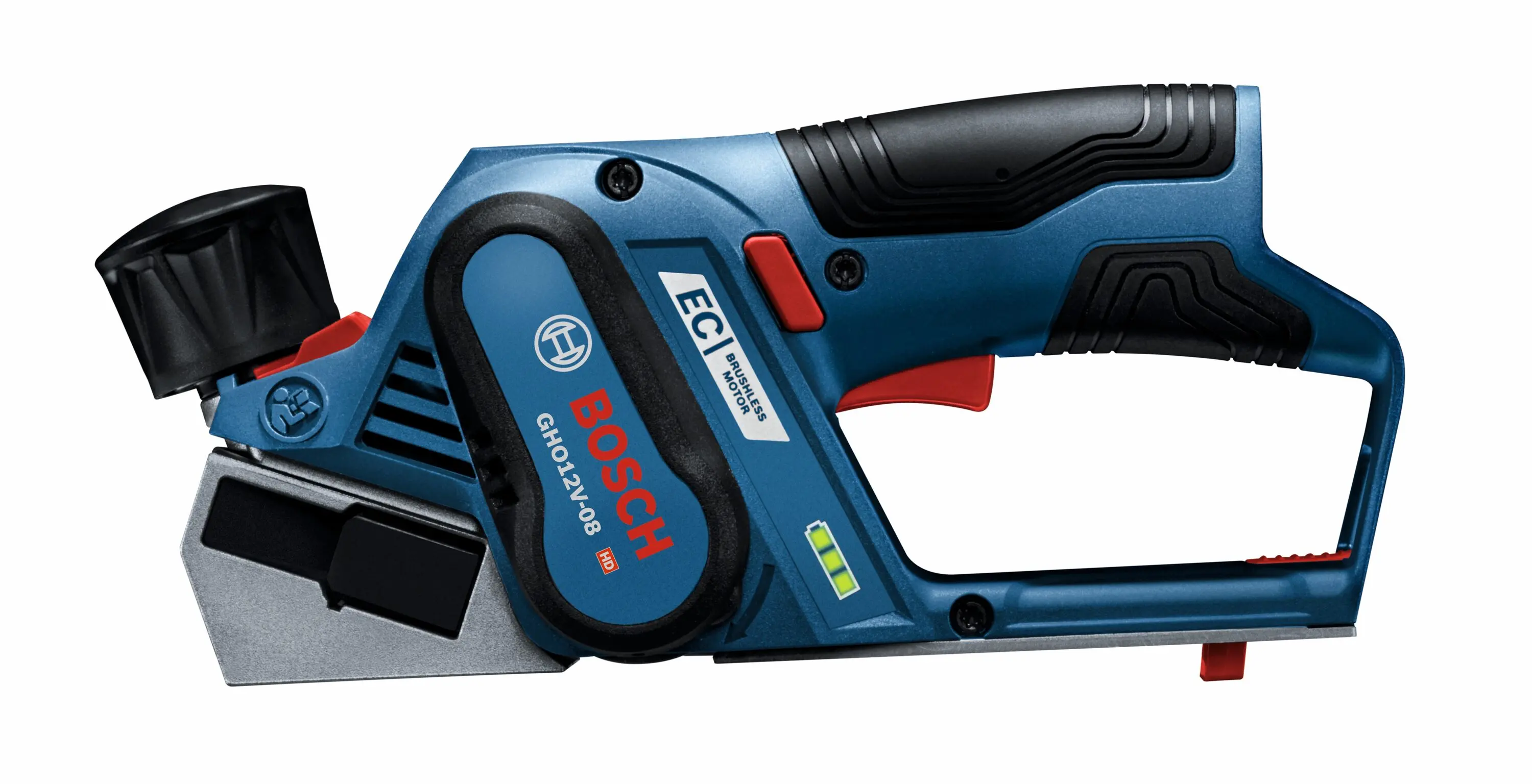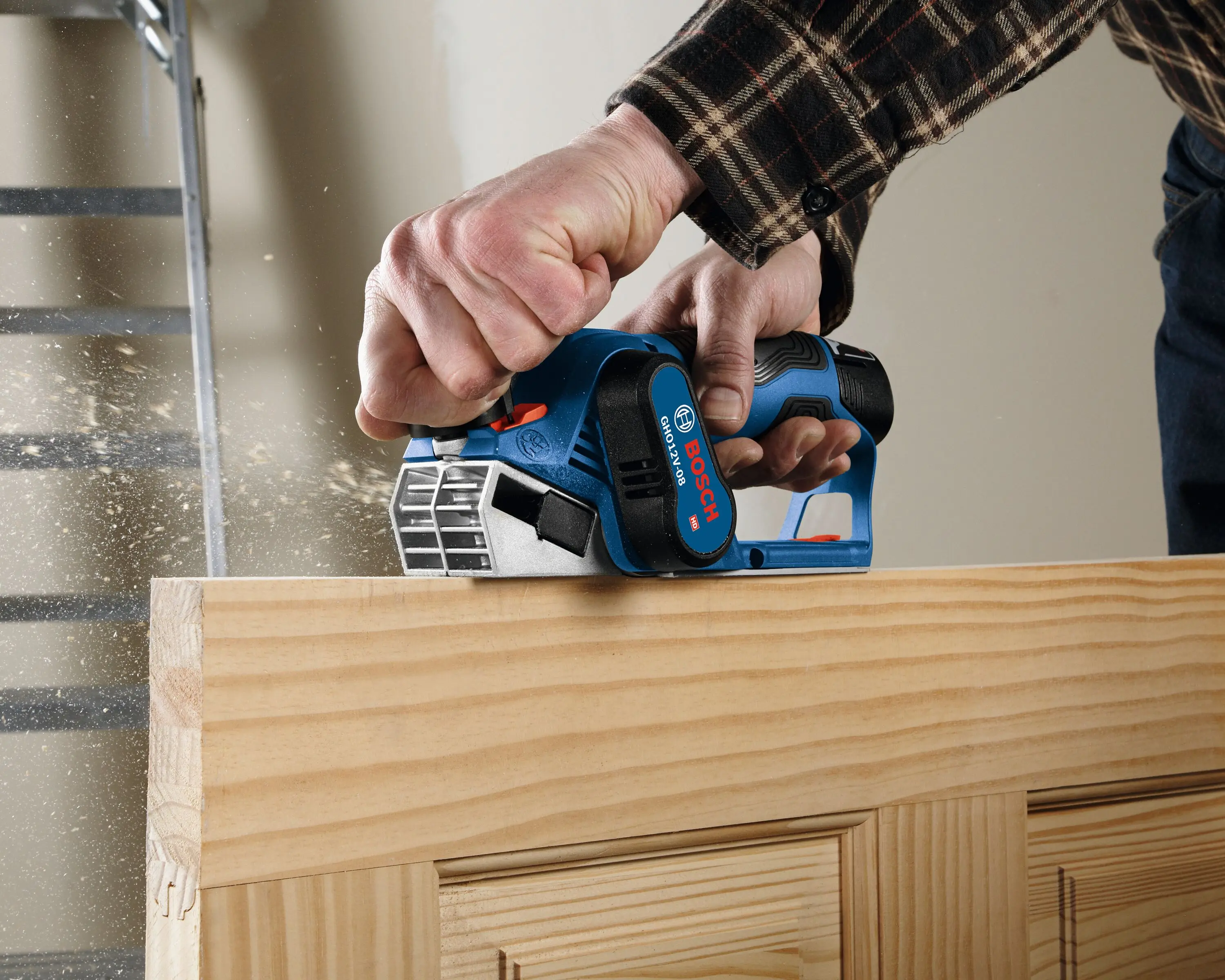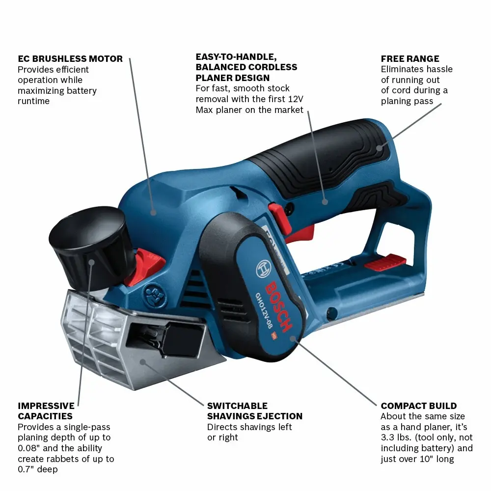 The Bosch GHO12V-08N 12V Max Planer combines powerful performance with a compact, easy-to-handle design. As the first 12V Max planer, it offers a 2.2-inch planing width and a 0.08-inch single-pass depth. Powered by an efficient EC Brushless motor, it delivers up to 33 feet of planing per battery amp-hour when working with 1-inch hardwood at 0.04-inch depth. Ideal for trimming doors, this cordless planer eliminates the hassle of cords, ensuring smooth, fast stock removal and professional-quality finishes. This is a bare-tool kit; the battery and charger are sold separately.