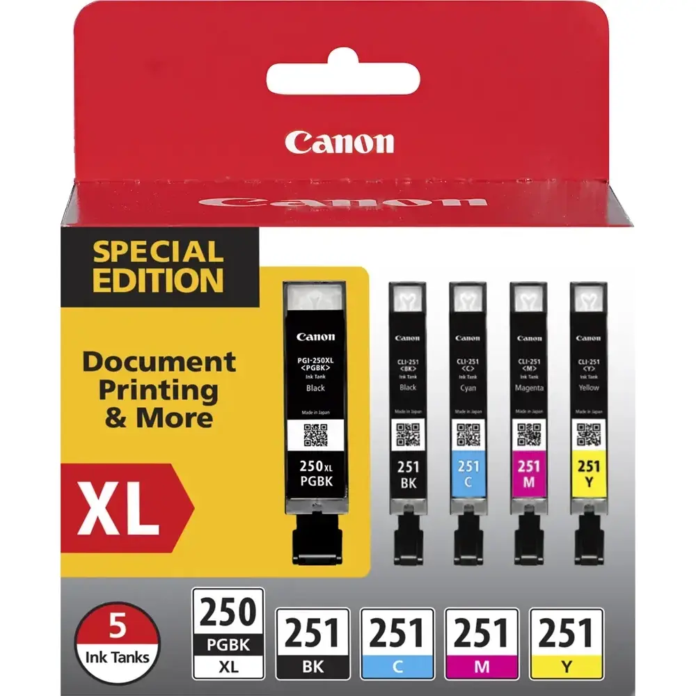 Get consistent, high-quality prints with the Canon 250 XL/CLI-251 5-Pack Special Edition Ink Cartridges, featuring Black, Cyan, Magenta, Yellow, and an Extra-Large Black cartridge for extended printing. Enjoy vivid, long-lasting colors and sharp text ideal for both photos and documents. The high-yield XL black cartridge reduces the need for frequent replacements, while the smudge-resistant and quick-drying ink ensures professional-quality results every time. Compatible with select Canon printers, this pack offers reliable performance for all your printing needs