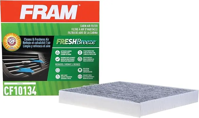 FRAM Fresh Breeze Cabin Air Filters can keep up to 98% of road dust and pollen particles from entering your vehicle to improve your driving comfort. Plus, it's the only cabin air filter with Arm & Hammer baking soda and activated carbon embedded in the filter media that can help remove odors flowing through the vehicle ventilation system.