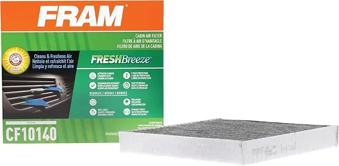Cabin air filters have proven to be essential to your vehicle as air quality can be severely affected by wildfire smoke, pollen and dirt. FRAM Fresh Breeze cabin air filter is the only cabin air filter that uses the natural deodorizing properties of ARM & HAMMER embedded in the filter to get rid of odor flowing through the ventilation system. FRAM cabin air filter filters 98% of these contaminants. Particles that enter the vehicle with outside air through the vehicle’s air conditioning, heating system and ventilation system can become concentrated and expose passengers to smoke, road dust, dirt and particles at higher levels than outside the car. Breathe in cleaner air with a FRAM Fresh Breeze Cabin Air Filter.