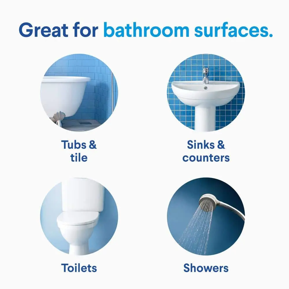 Tackle everyday bathroom messes with Clorox Disinfecting Bathroom Cleaner. Its bleach-free formula dissolves soap scum on contact and effectively removes dirt, grease, and grime from a range of bathroom surfaces. This cleaner also kills 99.9% of germs. Ideal for use on tubs, showers, glazed tiles, toilet bowl exteriors, sinks, and counters, it works on both white and colored hard surfaces. The lightly scented spray freshens as it cleans, leaving your bathroom smelling great. With its convenient spray bottle, keeping your bathroom clean is quick and easy. Clorox Bathroom Disinfecting Cleaner helps you maintain a spotless bathroom, killing germs like Salmonella, Staph, and Influenza A virus when used as directed on hard, nonporous surfaces.