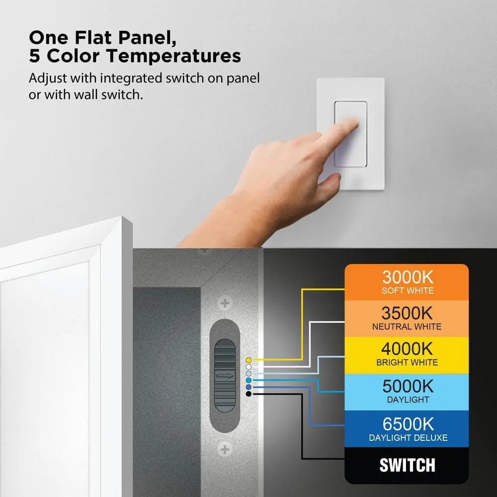 Illuminate any space with the Commercial Electric 2 ft. x 2 ft. White LED Non-Dimmable Flat Ceiling Fixture, designed for versatility and efficiency. Its ultra-slim, low-profile design (less than 1 inch thick) is ideal for low ceilings, while the edge-lit LEDs provide uniform, glare-free lighting with no bulbs to replace. The selectable color temperature switch lets you choose from soft white, neutral white, bright white, daylight, or daylight deluxe (3000K/3500K/4000K/5000K/6500K) or toggle between them using a standard light switch. This energy-efficient fixture consumes only 48 watts while delivering 4,250 lumens of bright, evenly distributed light—using up to 80% less energy than traditional incandescent bulbs. Built for longevity, it offers a 50,000-hour lifespan and supports easy installation in both flush mount and T-bar grid drop ceilings, making it perfect for residential and commercial settings.