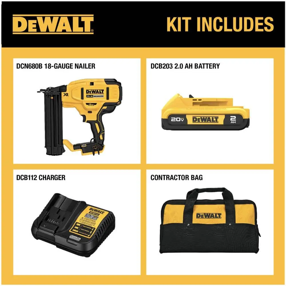 The DEWALT DCN680 18-Gauge Brad Nailer drives brad nails ranging from 5/8 inch to 2-1/8 inches, making it perfect for fastening decorative molding, casing, kitchen crown, and shoe molding. Powered by a brushless motor and a DEWALT 20V MAX Lithium-Ion battery, the DCN680 offers the performance of a pneumatic tool with the freedom of cordless operation—no need for gas, a compressor, or a hose. With maximum initial battery voltage of 20 volts (nominal voltage is 18 volts), this tool is designed to handle projects of any size efficiently.