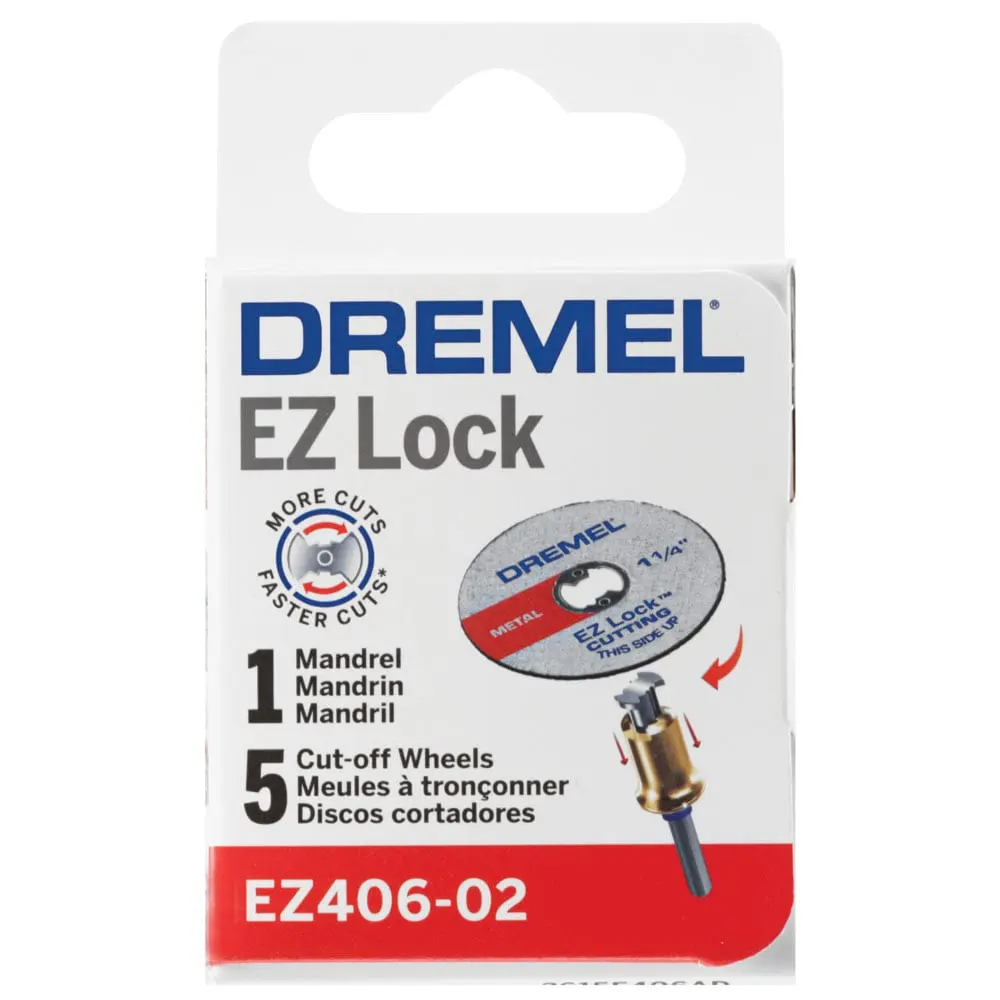 Transform your Dremel rotary tool into a powerful cutting machine with the EZ Lock Starter Kit. The EZ406-02 includes the EZ402 mandrel and five EZ456 Fiberglass Reinforced Cut-Off wheels, which are designed to last twice as long as the 426 model. These durable cut-off wheels feature a 1-1/2 inch (38.1 mm) diameter and a 0.045 inch (1.1 mm) thick blade, making them ideal for cutting, grooving, and trimming various metals, including hardened steel. They are perfect for tasks such as cutting bolt heads, reslotting damaged screws, cutting sheet metal, or trimming metal rods. Additionally, these cutting discs are suitable for delicate woodworking and can be used on materials like wood, plastic, and ceramics. The wheels utilize the patented EZ Lock system for quick and easy accessory changes.