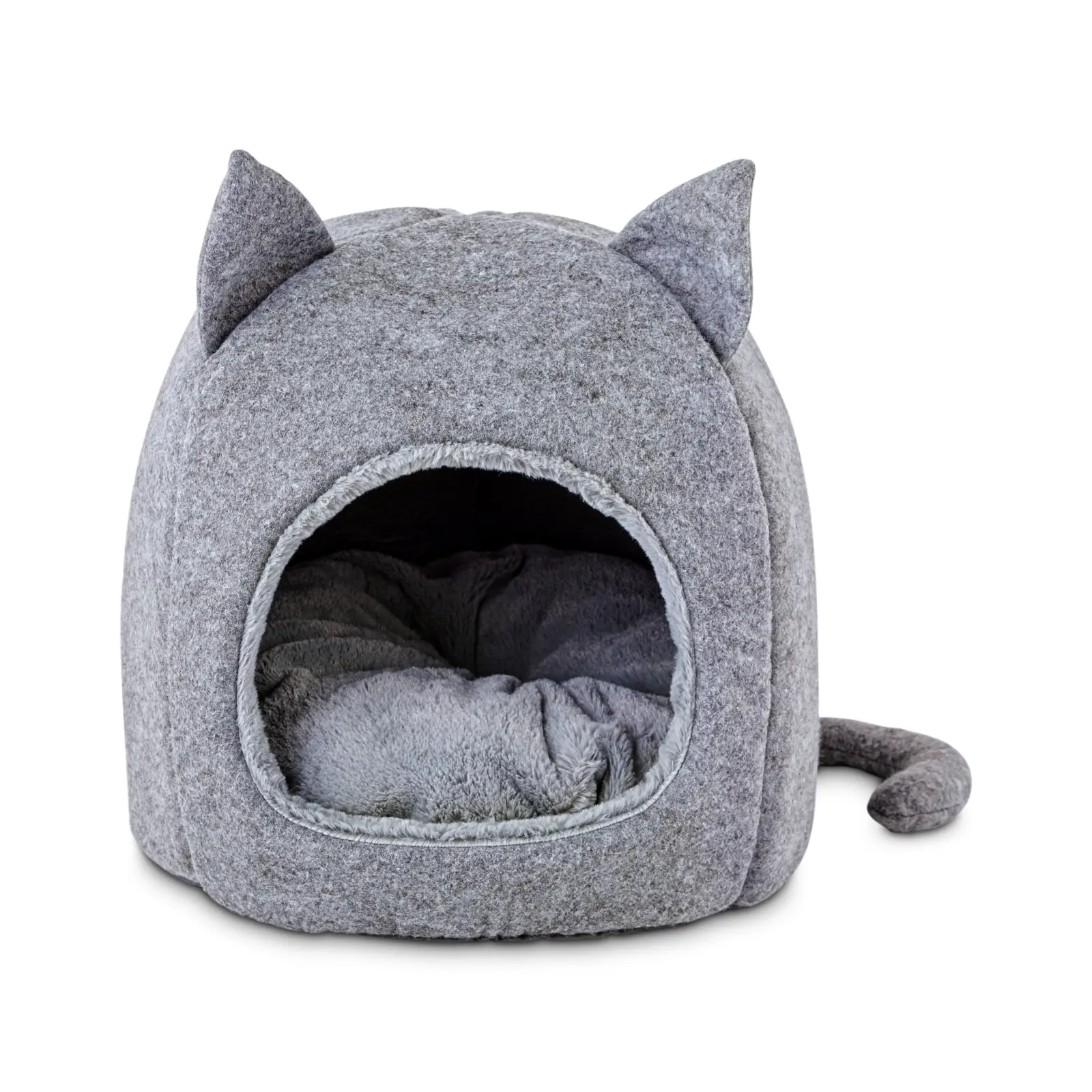 The EveryYay Snooze Fest Fellow Feline Hooded Igloo Cat Bed is a charming hideaway that your kitty will adore! With its whimsical feline shape, ears, and tail, this cozy retreat features a felt shell and plush interior, perfect for curling up in comfort and enjoying peaceful naps in solitude.