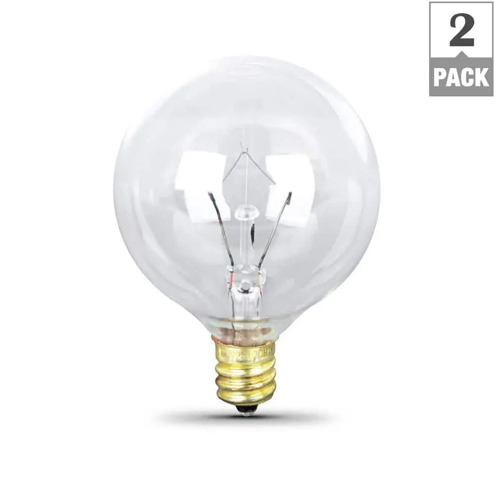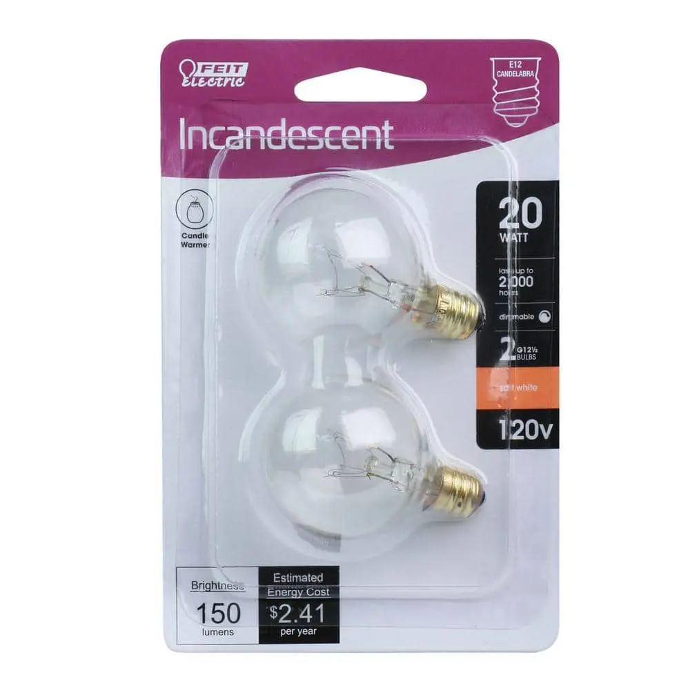 Enjoy peace of mind with the Feit Electric 20-Watt G12 1/2 Soft White Incandescent Appliance Light Bulb. This BP20G121/2/HDRP bulb replaces traditional incandescent bulbs, providing a soft white glow at 2700K while using only 20-Watts. Fully dimmable and featuring a candelabra base (E12), this bulb offers up to 2,000 hours of use, making it a reliable choice for various applications.