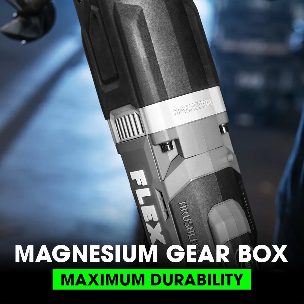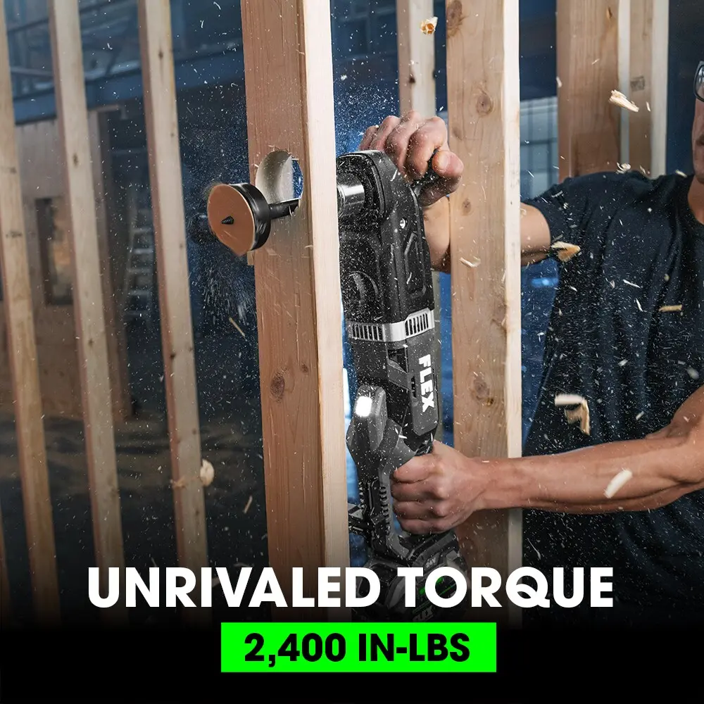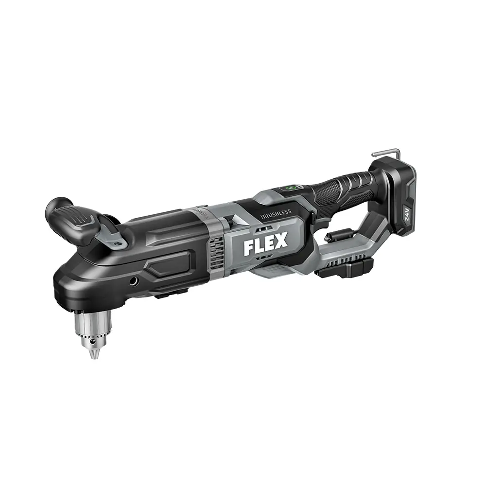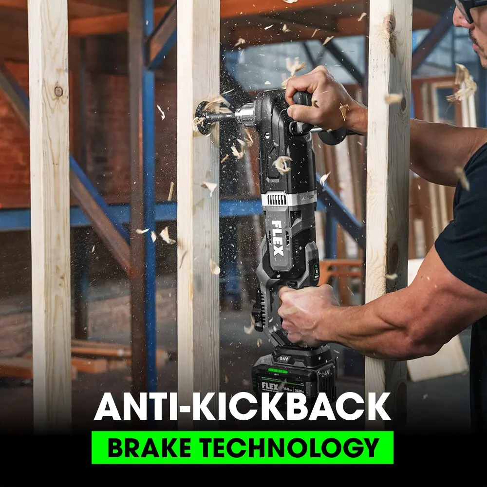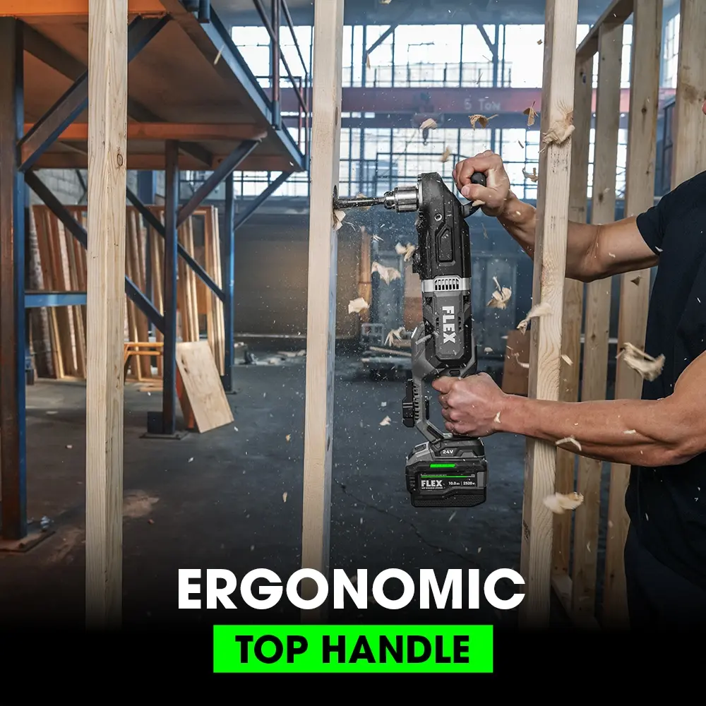 Effortlessly drill through stud after stud with the FLEX 24V 2-Gear 1/2 Right Angle Drill when installing pipe for plumbing. Designed for plumbers, this 1/2-inch right angle drill offers industry-leading torque of 2,400 inch-pounds. Turbo mode delivers maximum power and speed, reaching up to 1,650 RPM in Gear 2. Featuring a magnesium gearbox for superior durability in a lightweight design, it also includes anti-kickback technology for safer operation. The ergonomic rubber-covered top handle ensures comfort during extended use, while the built-in rafter hook provides convenient storage when the drill is not in use. For optimal performance, it's recommended to pair with the FX0221 24V 8.0Ah Lithium, FX0231 24V 12.0Ah Lithium, FX0331 6.0Ah Stacked Lithium, or FX0341 10.0Ah Stacked Lithium batteries (sold separately). This 2-gear right angle drill delivers the FLEX Advantage, offering unmatched battery power, extended runtime, and fast charging.