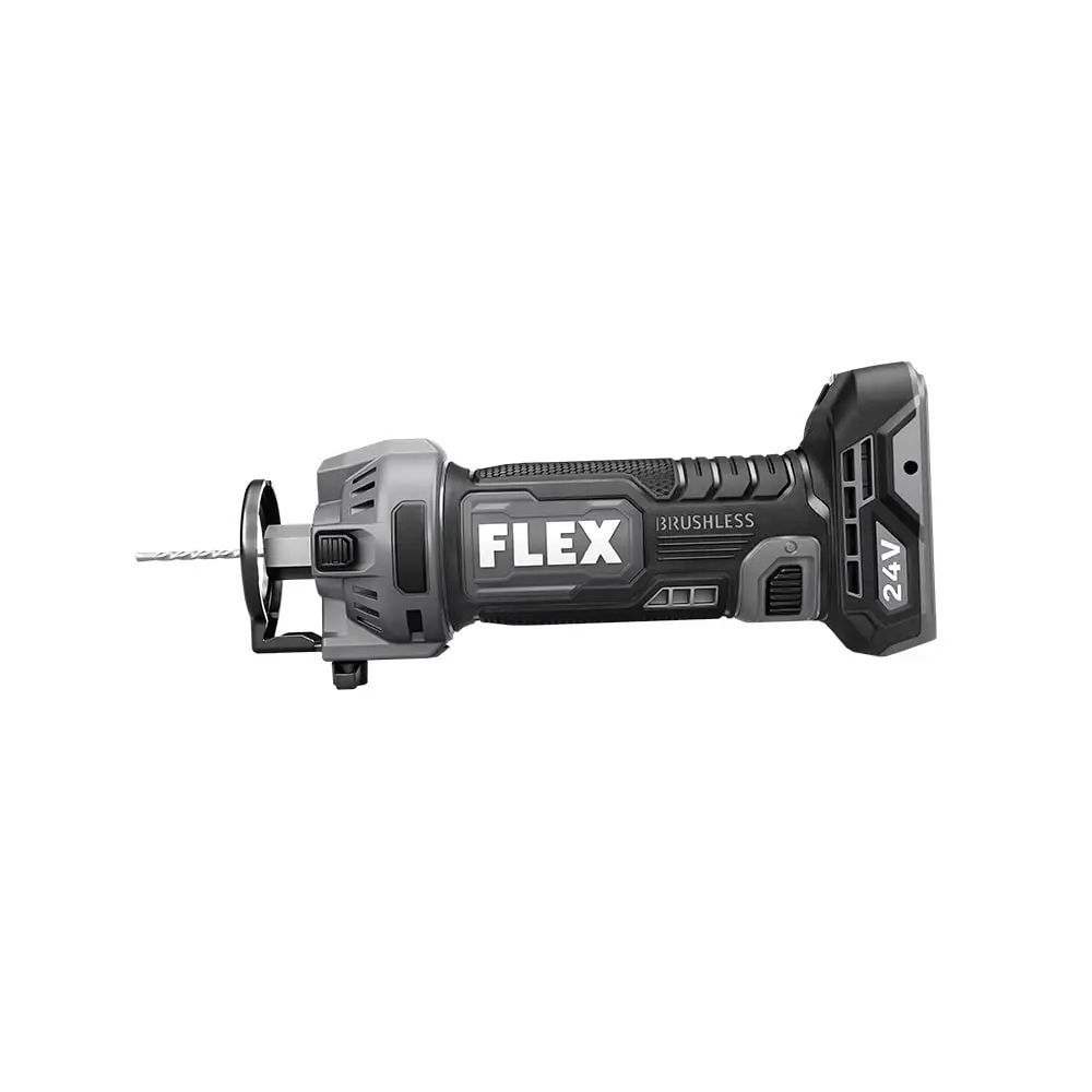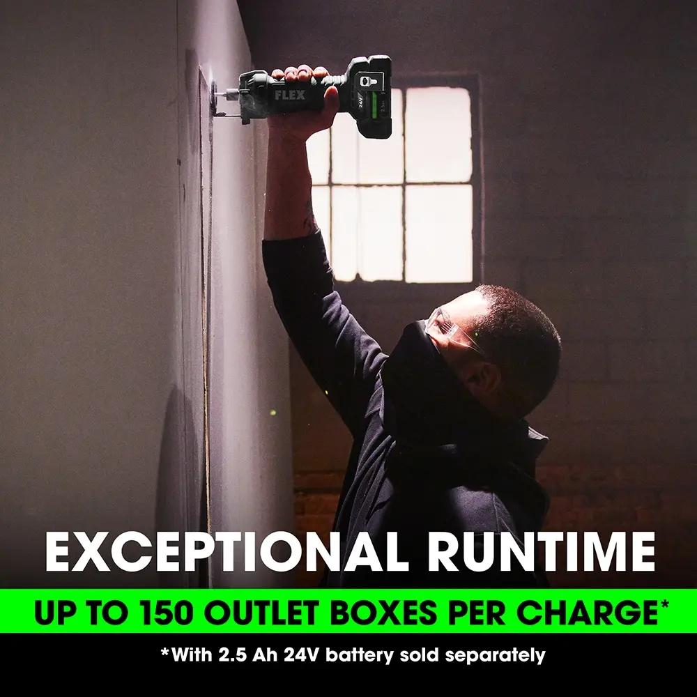 The FLEX 24V Drywall Cut Out Tool offers impressive runtime, cutting up to 150 outlet boxes on a single charge. Its adjustable airflow directs dust away from your work, and built-in LED lighting ensures visibility in low-light conditions. With the power of FLEX 24V batteries, you get superior performance, extended runtime, and quicker charging (battery and charger sold separately).