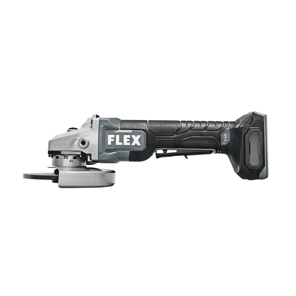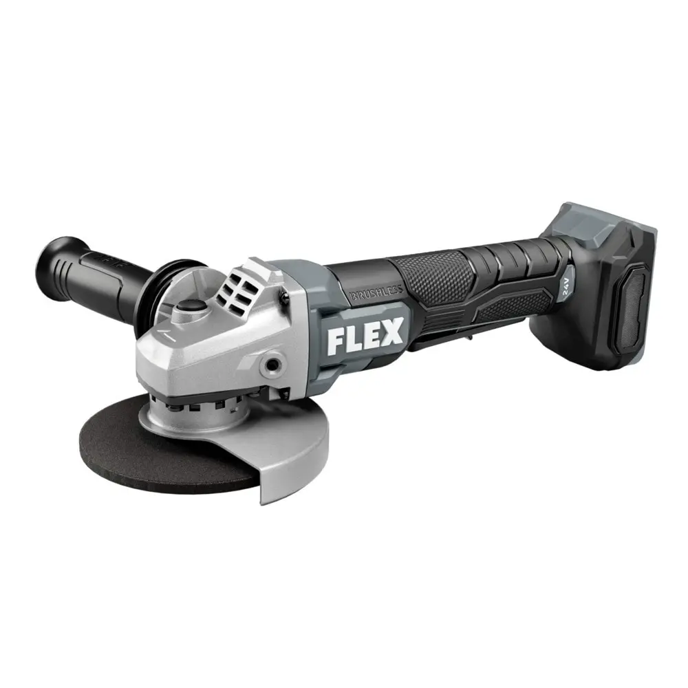 The FLEX 24V 5" Fixed Speed Angle Grinder with Paddle Switch brings advanced performance to the jobsite. Delivering up to 10,000 RPM of superior power, it ensures you work with confidence, precision, and control. Key features include anti-kickback protection, vibration suppression, and a convenient one-step guard adjustment. Designed for comfort, its ergonomic build and long-lasting runtime keep you working efficiently. All of this is backed by the FLEX Advantage, offering exceptional 24V battery power, extended runtime, and faster charging (battery and charger sold separately).