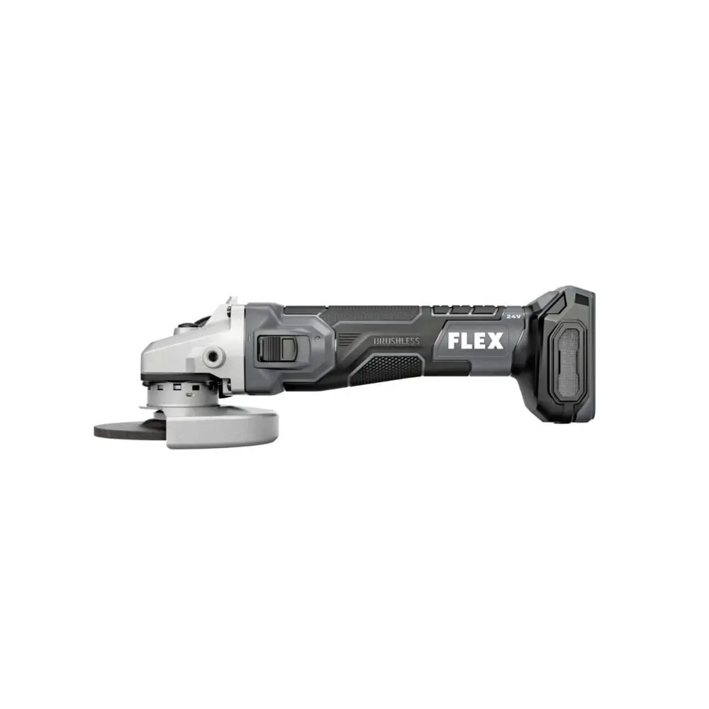 The FLEX 24V 5" Fixed Speed Angle Grinder with Side Switch brings advanced performance to your jobsite. It delivers up to 10,000 RPM of exceptional power while offering superior control and confidence during use. Key features include anti-kickback protection, vibration reduction, and a convenient one-step guard adjustment. Designed for comfort, this angle grinder's ergonomic build and impressive runtime keep you working longer. All of this is backed by the FLEX Advantagedelivering unbeatable 24V battery power, extended runtime, and faster charging (battery and charger sold separately).