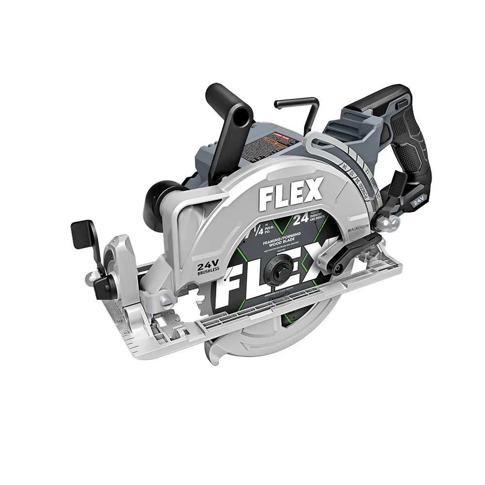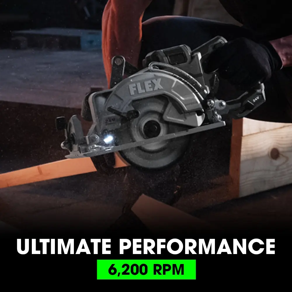 Cut through countless 2x4s effortlessly with the FLEX 24V 7-1/4" Rear Handle Circular Saw. This precision tool combines lightweight design with durability, featuring a blade positioned to the left of the motor and a rear handle for enhanced line of sight. Engineered for exceptional cutting performance and a maximum cutting capacity of up to 2-5/8 inches, it also includes a built-in LED light that illuminates the workpiece for greater precision and accuracy. Powered by the FLEX Stacked Lithium Advantage, this saw delivers outstanding 24V battery power, runtime, and fast charging capabilities (battery and charger sold separately).