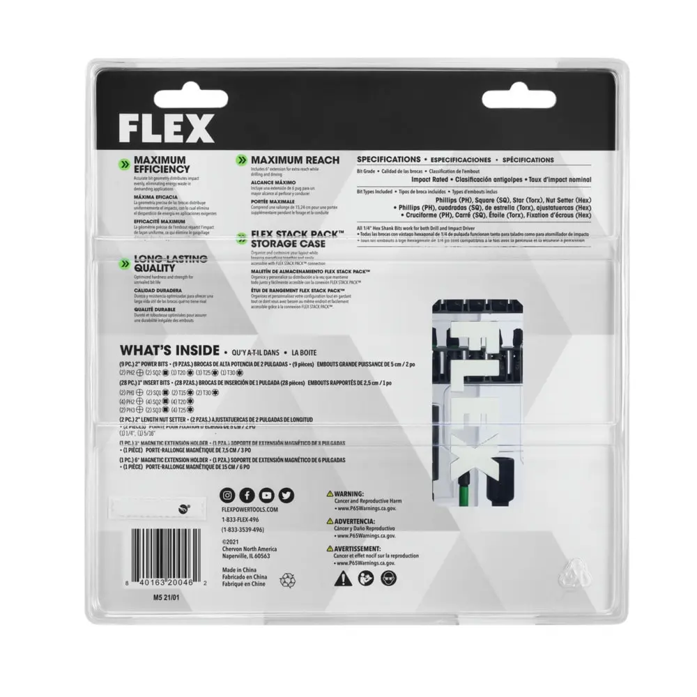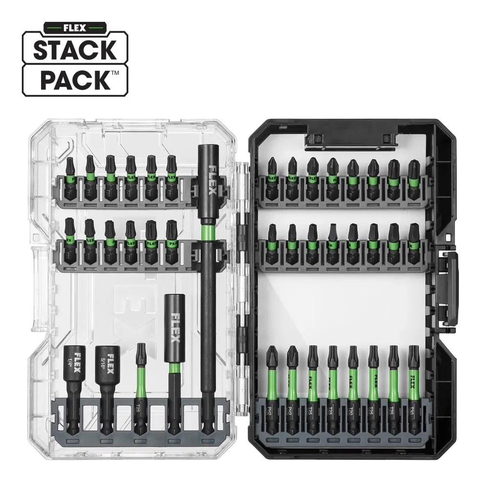 Tackle even the toughest tasks with precision, durability, and control in every bit. The FLEX 41-Piece Impact Drill and Driver Bit Set offers a broad selection of commonly used bit types and sizes, all designed for long-lasting performance. Each bit is engineered to distribute impact efficiently, maximizing energy transfer while minimizing waste. Featuring FLEX Impact Shield torsion, these bits are built to resist breakage and keep your workflow uninterrupted. The kit also includes extensions to provide extra reach for challenging driving applications. All components are neatly organized in a FLEX Stack Pack storage case for easy access and convenience.