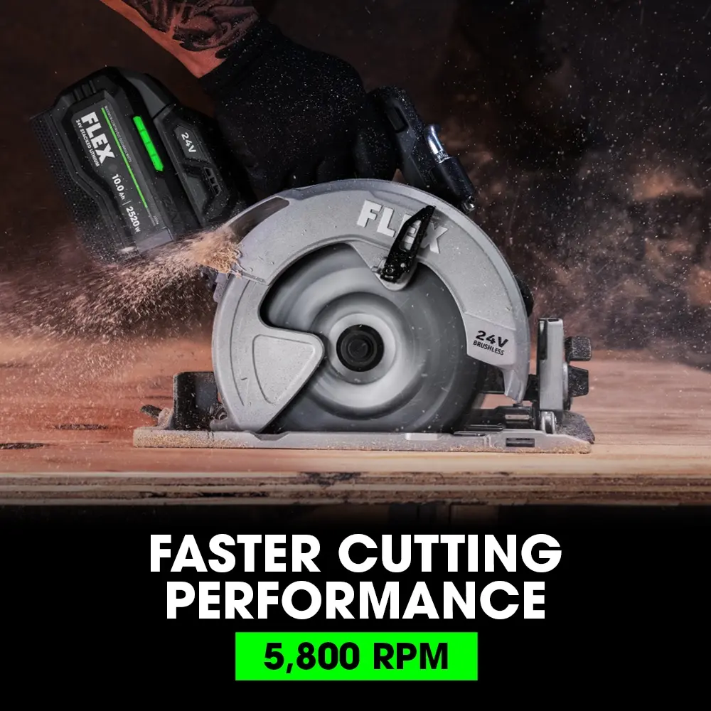 Effortlessly cut through extensive amounts of 2x4s with the FLEX 24V 7-1/4" Circular Saw. This lightweight yet robust tool is designed for high-performance cutting and offers an impressive cutting depth of up to 2 5/8 inches. A built-in LED light brightens your workspace, ensuring precision and accuracy in every cut. Powered by a strong motor and the FLEX Stacked Lithium Advantage, this saw provides exceptional battery power, extended runtime, and quick charging (battery and charger sold separately).