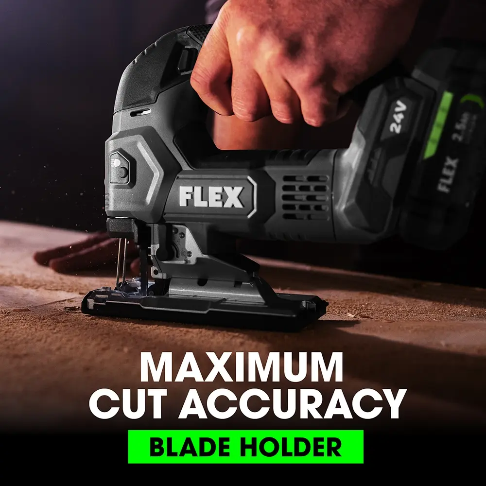 Achieve unparalleled precision and control with the FLEX 24V D-Handle Jigsaw. This tool offers four adjustable speeds along with an auto mode for versatile cutting. The dual-guide blade holder enhances accuracy, while the integrated LED light provides visibility for confident cuts. Blade changes are quick and effortless with the one-touch blade eject feature. Plus, youll benefit from the FLEX Advantage, featuring exceptional 24V battery power, extended runtime, and faster charging (battery and charger sold separately).