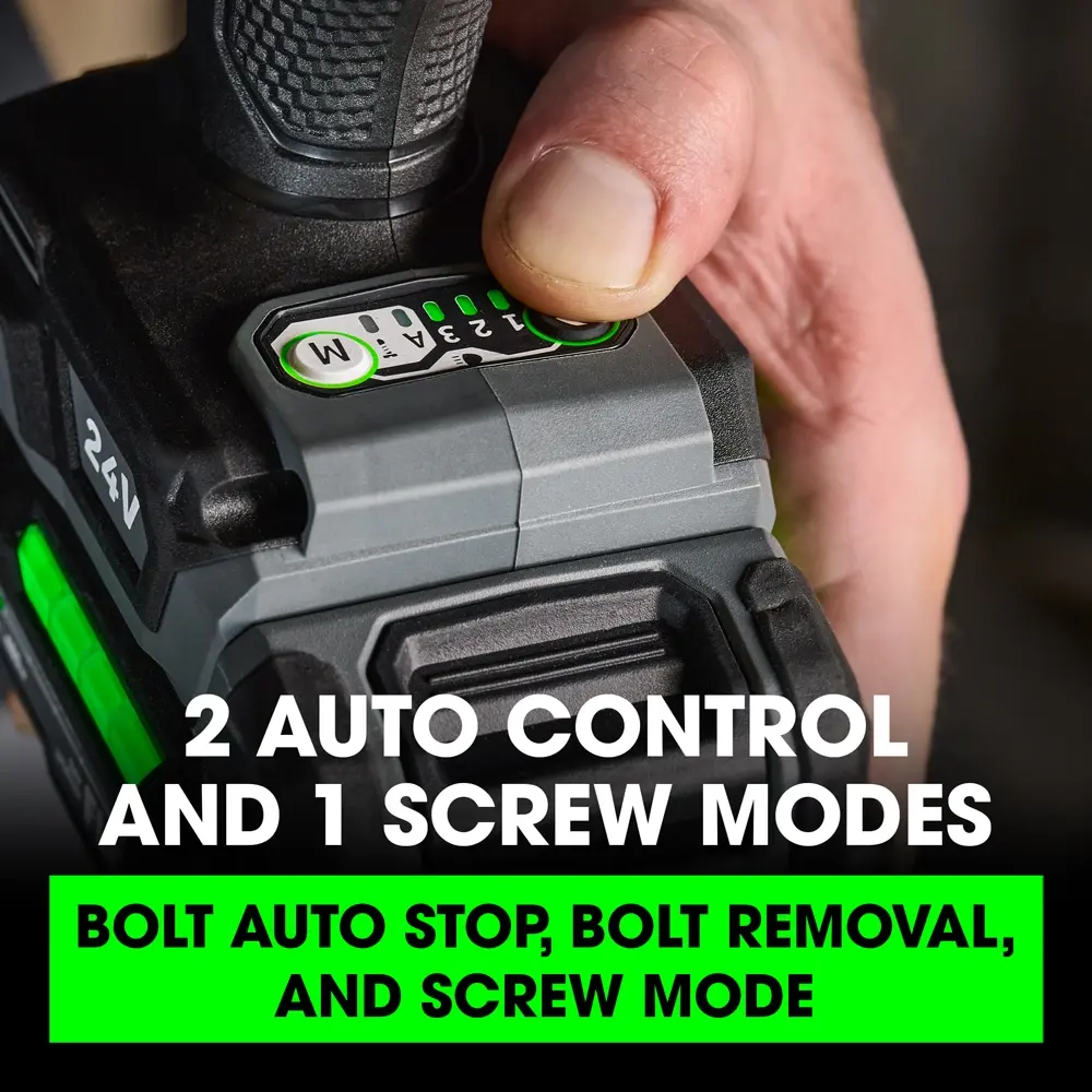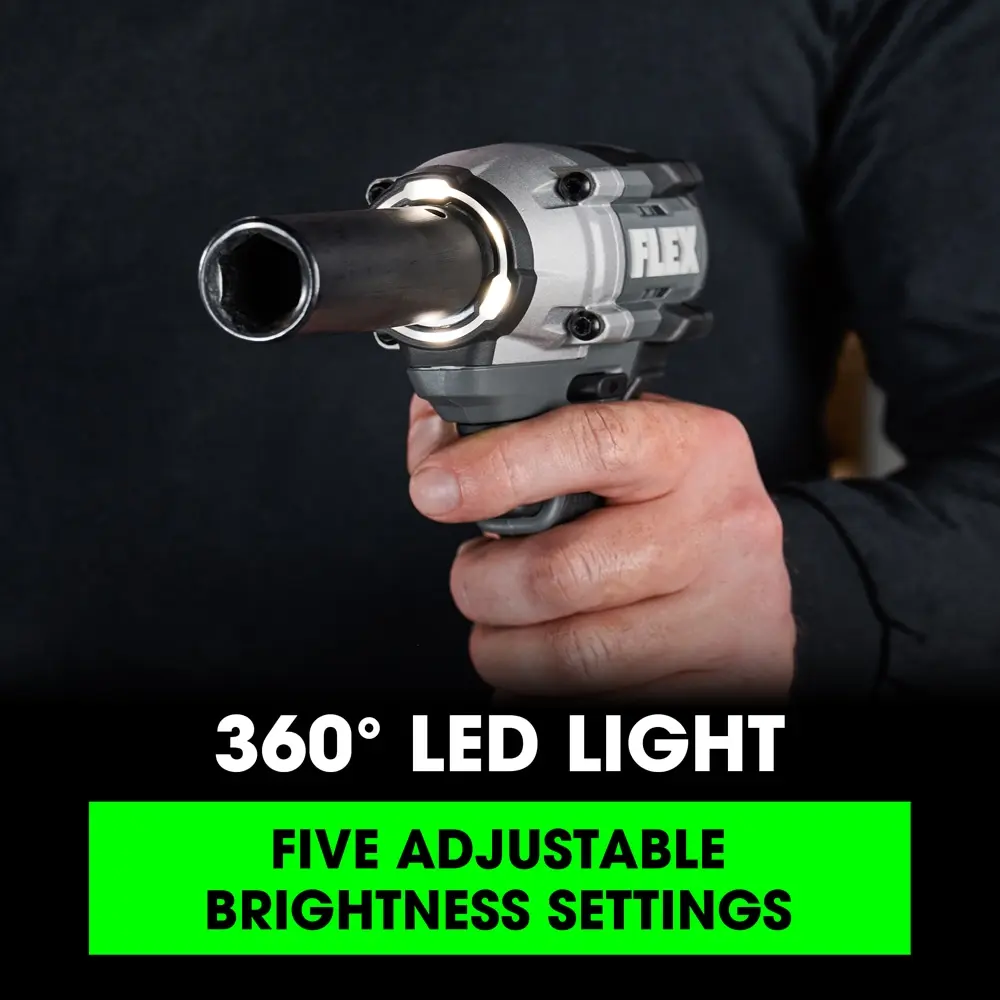 The FLEX 24V 1/2 Compact Impact Wrench combines impressive power in a lightweight design, making it perfect for tackling tough tasks in hard-to-reach areas. This compact cordless impact wrench is 38 percent lighter than the larger FX1451 model, making it an excellent choice for automotive and framing jobs. With 300 foot-pounds of fastening torque and 450 foot-pounds of nut-busting torque, its equipped for demanding applications.The Bolt Auto Stop Mode prevents over-tightening, breaking, or stripping bolts, while Bolt Removal Mode automatically stops the tool when it detects that a bolt is loosened. Additionally, Screw Mode offers faster speeds for driving SDS screws into materials like pine or LVL. The 360-degree LED provides illumination in dark spaces with five adjustable brightness settings.Its ergonomic design, soft-grip handle, and variable speed trigger ensure optimal balance, comfort, and complete control. This compact impact wrench delivers the FLEX Advantage of exceptional battery power, extended runtime, and quick charging (battery and charger sold separately).