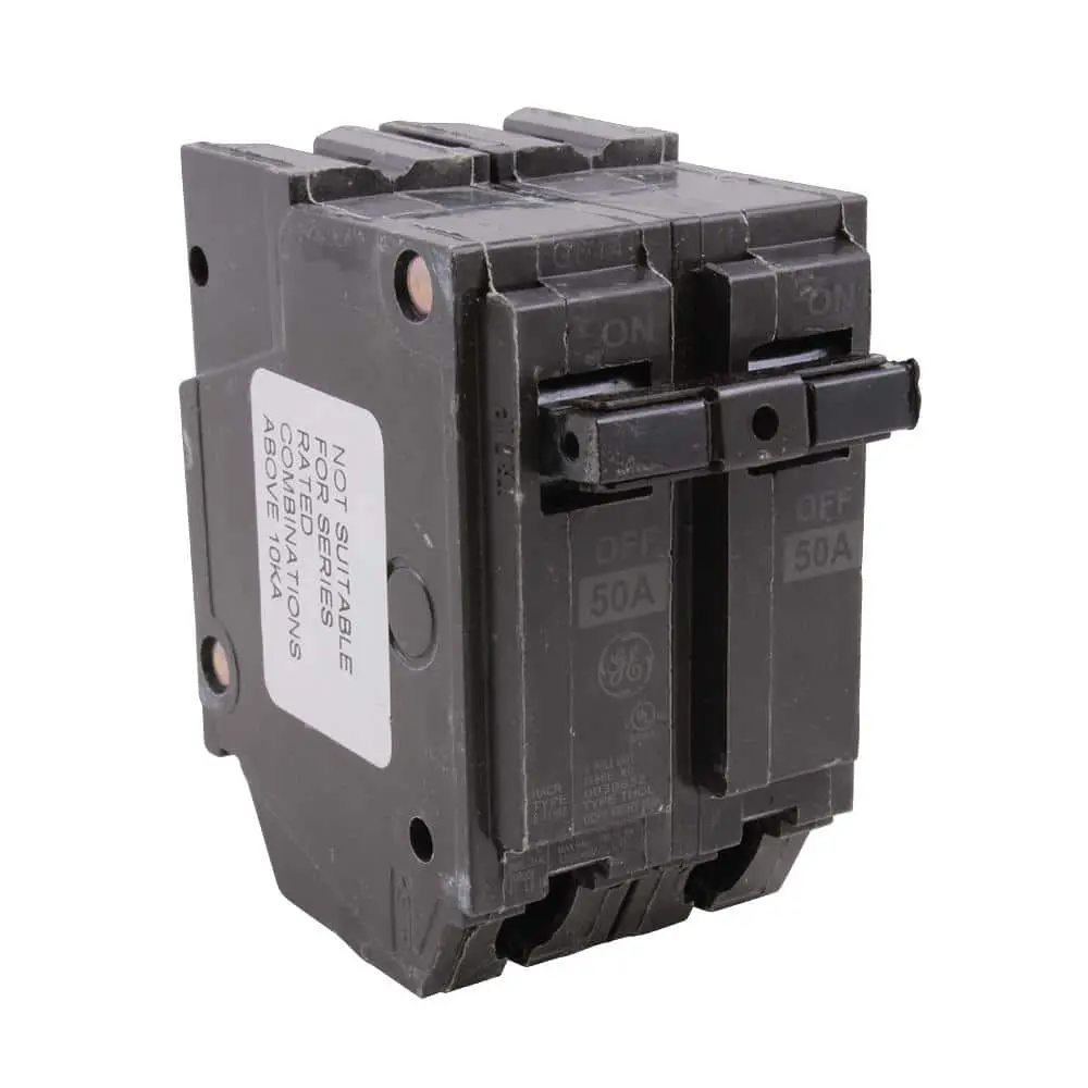 The GE Q-Line 50 Amp 2-Pole Circuit Breaker is built for durability and reliable performance. It features a cemented calibration screw that ensures stability by preventing shifting, resulting in consistent operation. Tin-plated copper stabs provide durable, corrosion-resistant connections, while the heat-resistant thermoset case enhances structural integrity and stability.