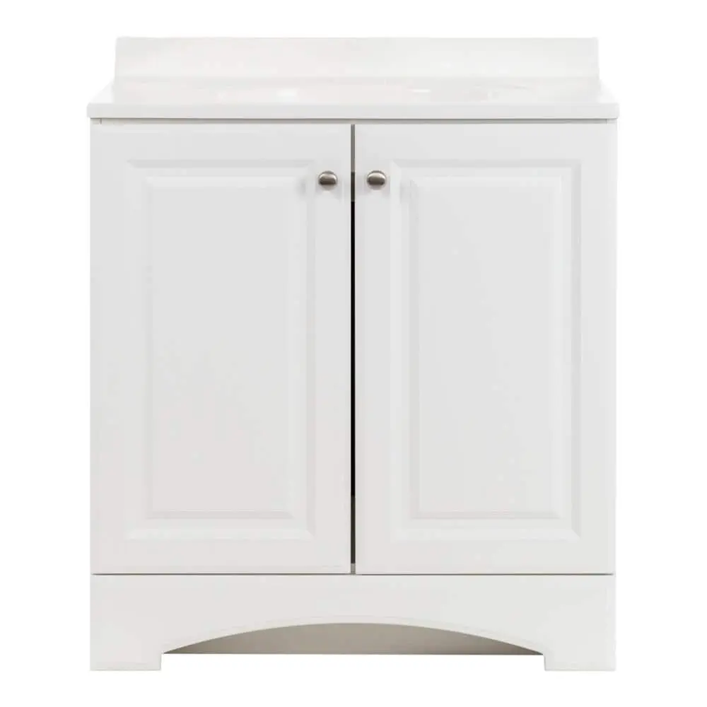The 30.5-inch wide Glacier Bay bathroom vanity in white showcases a 2-door cabinet and a white cultured marble vanity top. This freestanding unit features a full-overlay raised-panel design, complemented by satin nickel pulls for a timeless appearance. The predrilled white cultured marble vanity top includes an integrated oval sink, finishing off the set. Designed for convenience, this pre-assembled bathroom vanity has an open-back design, 6-way adjustable cabinet hinges, and an unattached vanity top for straightforward installation and plumbing access.