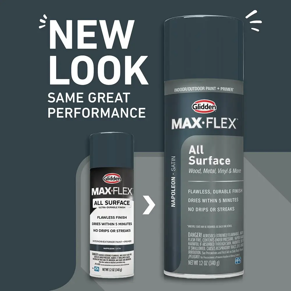 GLIDDEN MAX FLEX All Surface is an advanced interior/exterior paint and primer spray paint featuring revolutionary technology that ensures exceptional coverage and delivers an ultra-durable finish on a versatile range of surfaces, including wood, metal, plastic, and glass. With its unique spray pattern designed for a broader, smoother application, GLIDDEN MAX FLEX covers surfaces more efficiently than traditional conical spray patterns, drying within just 5 minutes to expedite your projects with ease and confidence. Key highlights include innovative spray paint technology for excellent coverage, a quick drying time that minimizes waiting between coats, drip-free and streak-free application, a specialized formula for a professional factory finish, and its deep blue-black color. This rich hue adds depth and sophistication to any space, making it perfect for creating impactful accents or transforming entire rooms both indoors and outdoors.