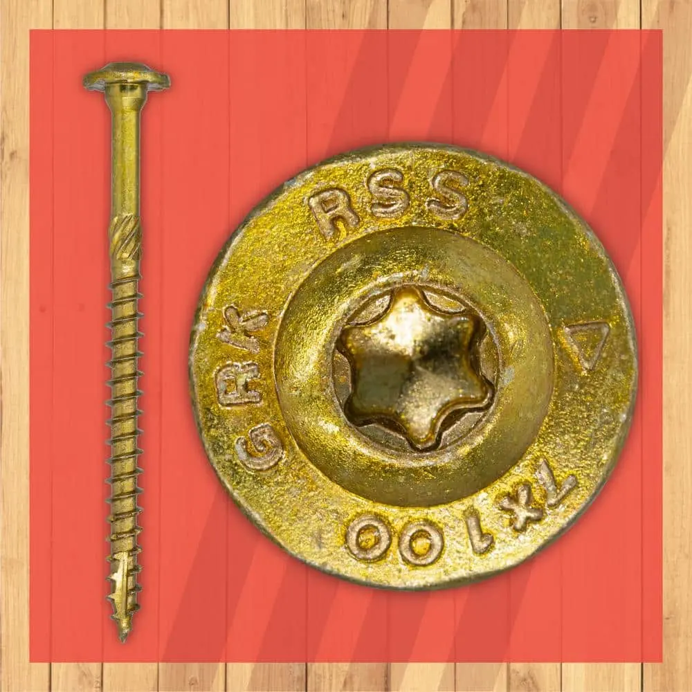 The GRK Fasteners RSS screw is crafted from hardened steel and coated with Climatek for enhanced corrosion resistance. Its sharp threads and point grip quickly into materials, including hardwood, minimizing the risk of splitting. The washer-style head has smooth edges, unlike traditional lag screws, and the shoulder beneath the washer ensures the screw is centered in pre-drilled holes.