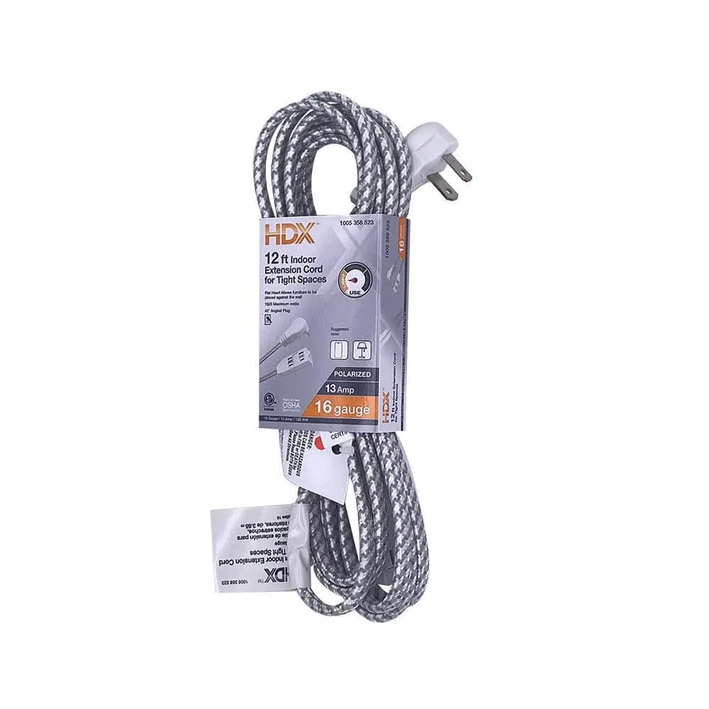 The HDX 12 ft. 16/2 Braided Extension Cord offers convenience and functionality with 3 polarized outlets, making it ideal for table lamps, floor lamps, small appliances, phone chargers, and other electronic devices. Each outlet is equipped with a safety cover for enhanced protection. The 12 ft. durable fabric cord provides a stylish and tangle-resistant solution, perfect for your home or workspace. The low-profile 45° flat plug saves space and allows furniture or media to sit closer to the wall. This cord has a 13 Amp, 125-Volt, and 1,625-Watt electrical capacity for reliable performance.