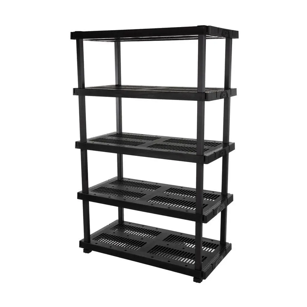 The HDX 5-Tier Plastic Adjustable Garage Storage Shelving Unit is the perfect storage solution for organizing your space. Crafted with durable plastic construction, it offers both strength and lightweight convenience for long-term use. Featuring 5 adjustable shelves, it allows for customizable storage to accommodate items of various sizes. The shelving unit can hold up to 250 lbs. per shelf, making it suitable for heavy-duty storage needs. Its easy assembly ensures a quick setup without any tools. With dimensions of 48 in. W x 75 in. H x 24 in. D, it provides ample space while still fitting into smaller areas. The sleek black finish gives it a modern touch that blends well with any decor.