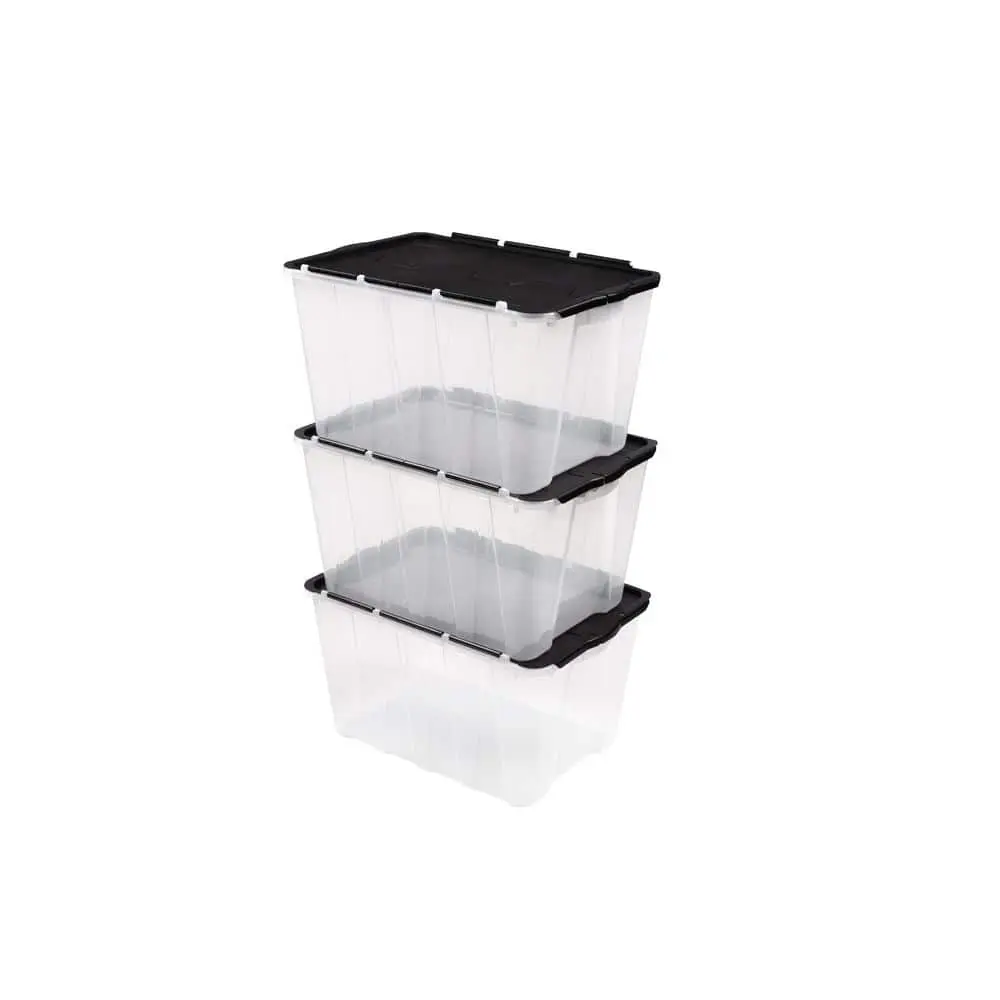 The HDX Clear 12 Gal. Flip Top Storage Tote offers a durable and transparent plastic design, allowing for easy identification of stored items. Its flip-top lid ensures secure closure while providing quick and convenient access to your belongings. Designed for efficient stacking, this tote helps maximize storage space in your home, garage, or office. With its lightweight yet sturdy construction, it is perfect for organizing household essentials, seasonal decorations, or office supplies