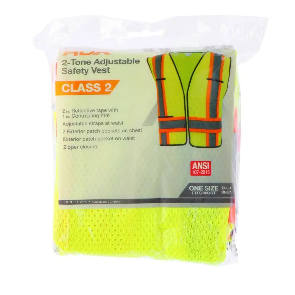 This ANSI Class 2 Hi-Viz Yellow mesh vest is designed for superior visibility and comfort. It features 2-tone H-shaped 2-inch silver reflective tape with 0.75-inch contrasting Hi-Viz orange trim for enhanced safety. Crafted from breathable and lightweight mesh fabric, the vest includes adjustable break-away flaps around the waist for a customized fit. A Hi-Viz lime green front zipper ensures a secure closure, and the vest provides ample storage with one interior and one exterior pocket.