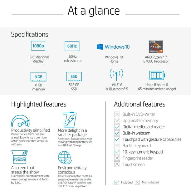 The HP Pavilion 15.6" Laptop is built to deliver both entertainment and performance. With its FHD display, rich audio powered by B&O, and powerful AMD Ryzen processor, this laptop offers an immersive experience whether you're streaming, working, or video chatting. Its sleek, durable design and fast-charging battery make it perfect for productivity on the go.