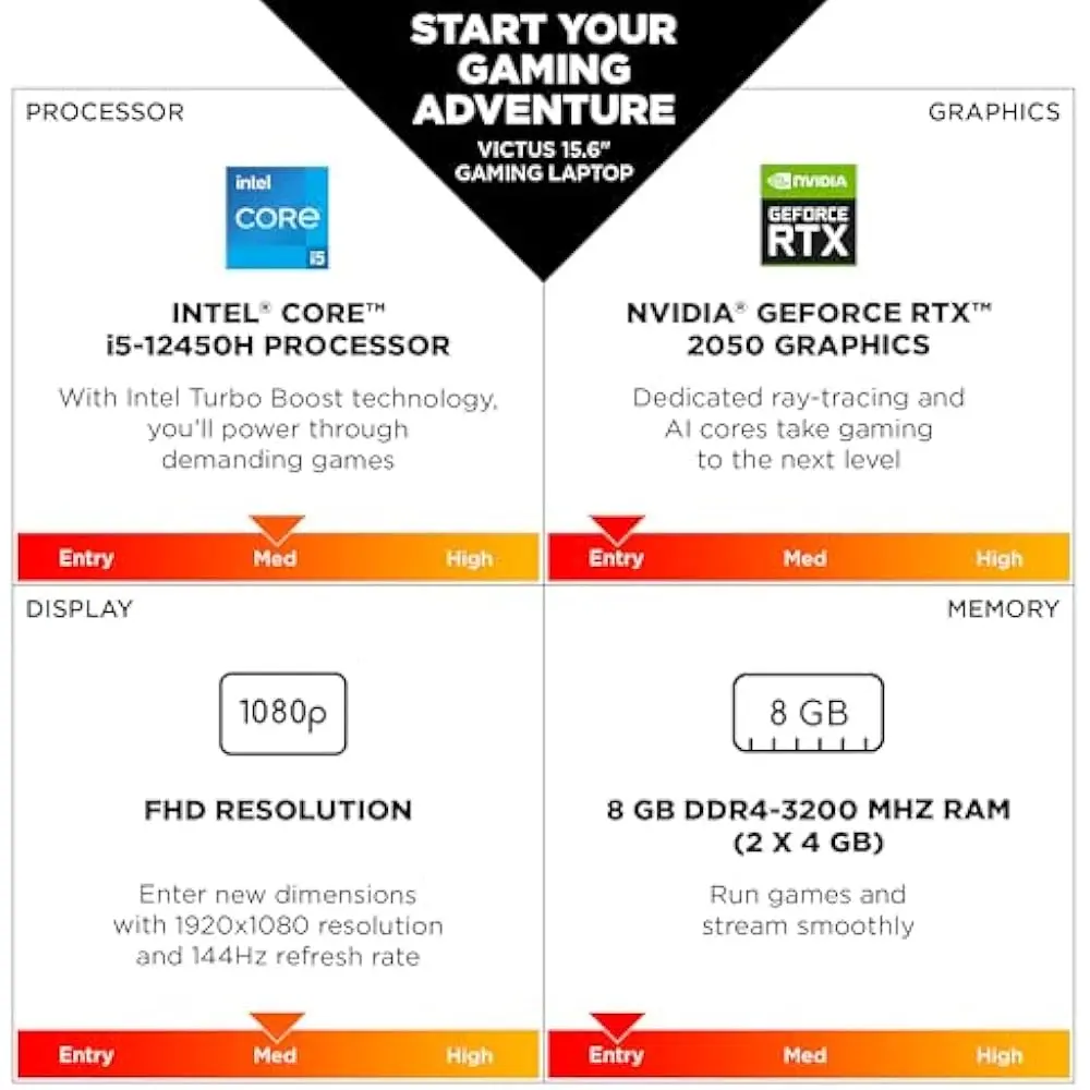 The HP Victus 15.6-inch Gaming Laptop is designed for gamers who demand performance and portability. It features an Intel Core i5-12450H processor, providing robust performance for gaming and multitasking. With a 15.6-inch Full HD display boasting a 144Hz refresh rate, the laptop ensures smooth visuals and reduced motion blur, enhancing the gaming experience.