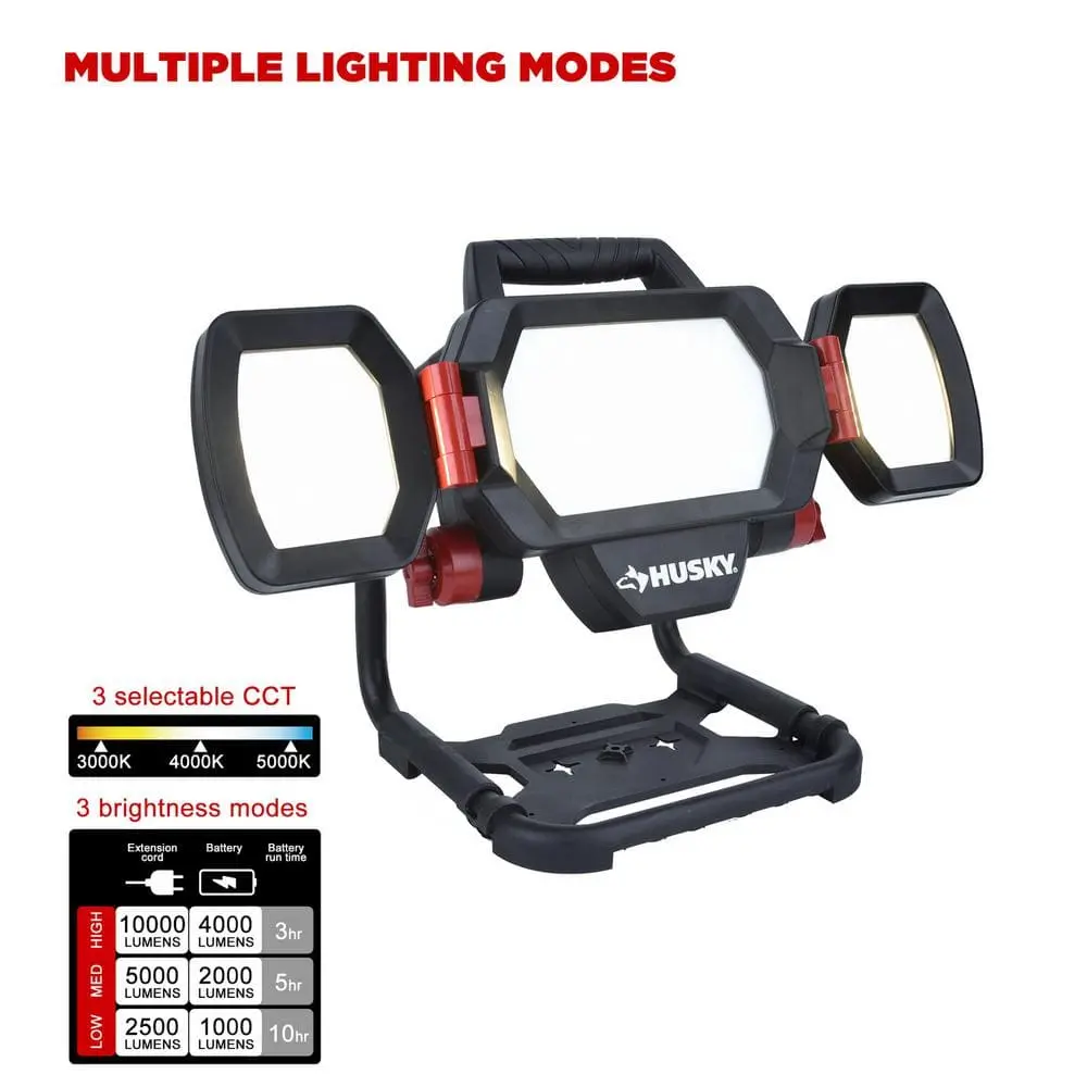 This high-intensity, dual-power LED work light is designed for maximum versatility. It operates both on its integrated lithium-ion battery and through an AC extension cord for continuous power. The rechargeable battery provides up to 10 hours of cordless runtime, and the power indicator lets you know when it's time to recharge. Once the battery is depleted, simply plug in the included 5ft AC power cord and keep working without interruption. Built with durable, die-cast aluminum, this light is both strong and reliable. It features two adjustable side lights that pivot 180° and 270°, with the main light supporting 180° vertical rotation. Choose from three selectable color temperatures (CCT) – 3000K, 4000K, and 5000K – to suit any project. With up to 10,000 lumens under AC power and 4,000 lumens on DC, it’s perfect for everything from auto repair to construction. Additionally, the light is foldable, easy to carry with its grip handle, and offers USB-A and USB-C outputs for charging portable devices.