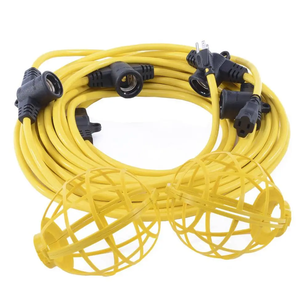 The Husky 50 ft. 5-Light Commercial-Grade Cage String Light is an ideal temporary lighting solution for both indoor and outdoor spaces. Perfect for construction sites, tunnels, basements, garages, parking areas, festivals, and more. Designed with weather-resistant PVC-coated sockets and durable 14-gauge wire to withstand harsh conditions. Sturdy plastic cages protect bulbs from damage while accommodating A19 to A23 size bulbs up to 150 watts (bulbs not included). The bright yellow finish ensures high visibility. Featuring 5 medium base E26 sockets spaced 10 feet apart, this string light is linkable, allowing up to 4 sets (200 ft.) to be connected for broader coverage. Each socket includes an eyelet for easy hanging. UL tested for quality and safety.