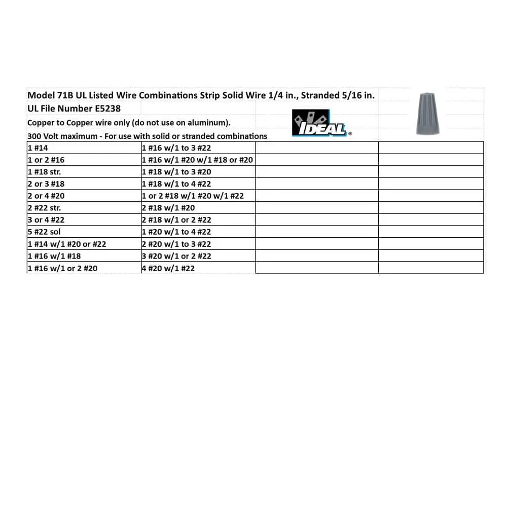 The IDEAL Wire-Nut Wire Connector, an American classic, revolutionized electrical connections when introduced in 1928 as the first screw-on wire connector. Known for its innovation, quality, and convenience, it features a fixed square-wire spring and a positive grip shell for secure, long-lasting connections. Designed for fine stranded wire applications, its flame-retardant thermoplastic shell withstands environmental extremes and is reusable for circuit changes or additions.