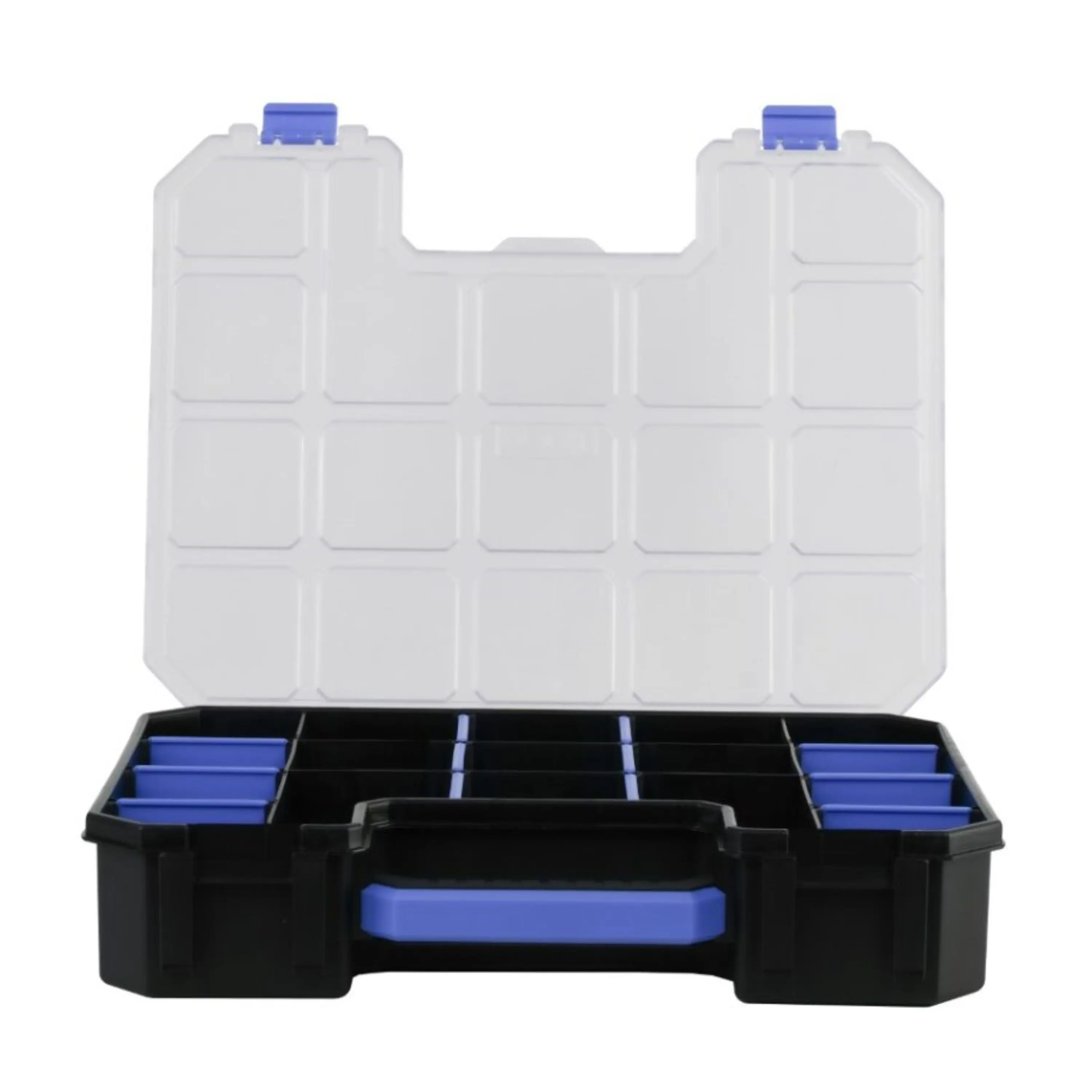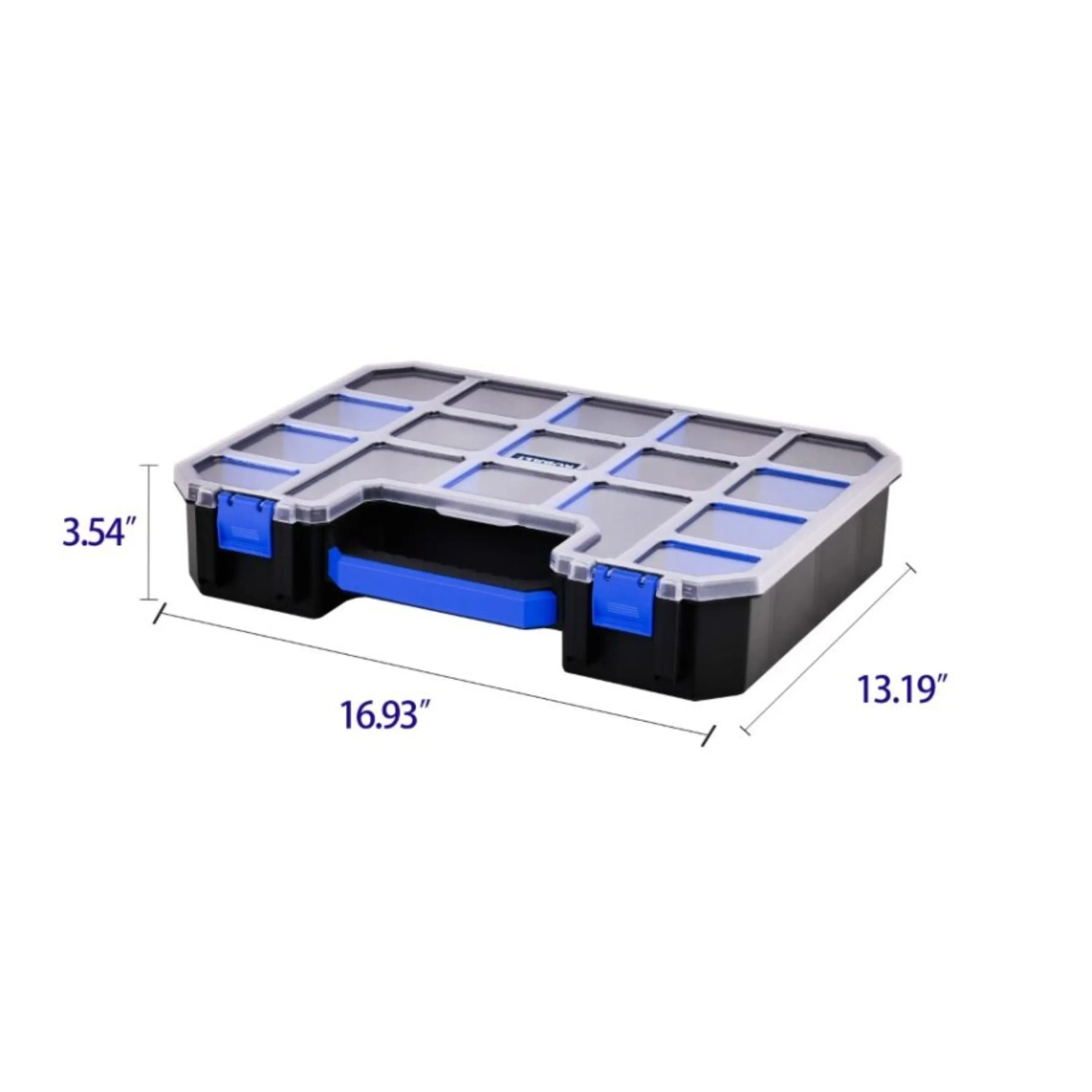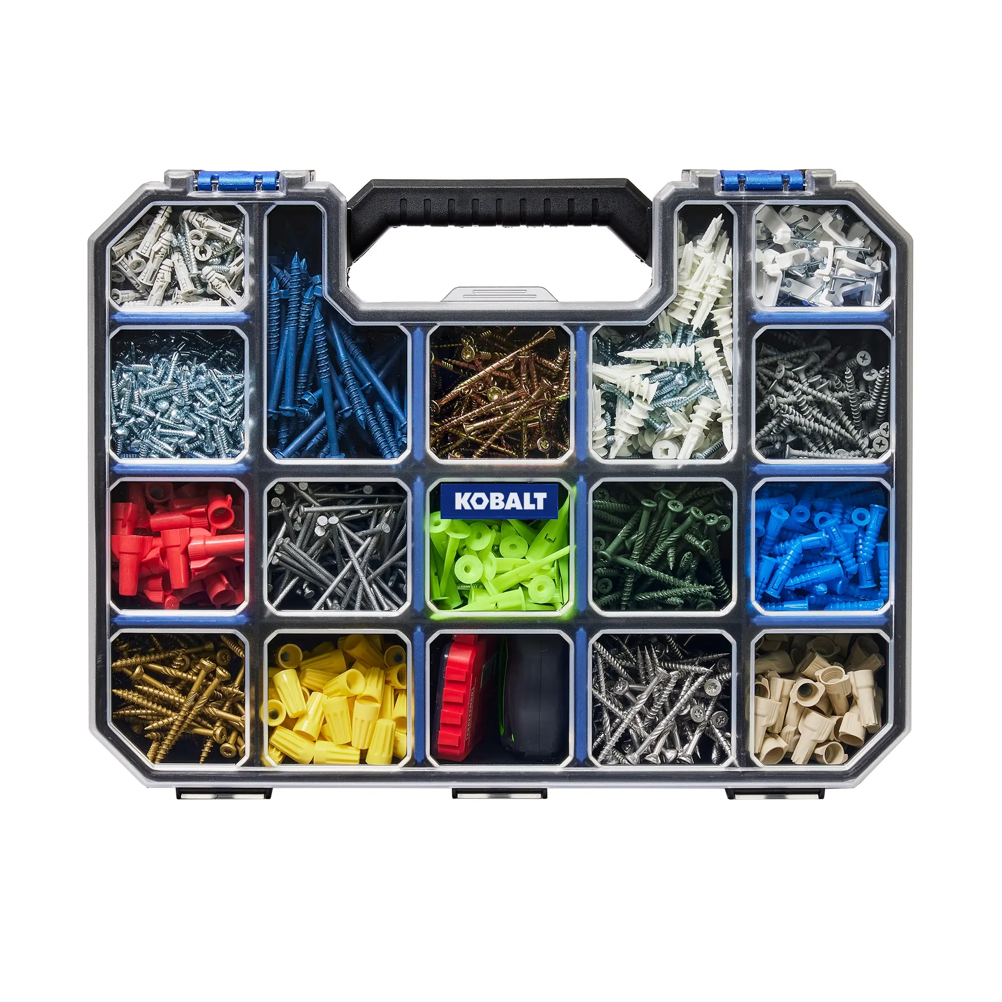 The KOBALT Deluxe Professional Divided Case is a must-have for keeping your truck, garage, workshop, office, or home neat and organized. With 17 compartments, this pro organizer allows you to customize your storage to fit your needs. Simply fill it with the parts you require and you're ready to go! The secure lid latches firmly to ensure all your contents stay in place during transport. Constructed from rugged high-density polypropylene, this heavy-duty organizer features removable dividers for maximum flexibility, enabling you to create any arrangement you desire.