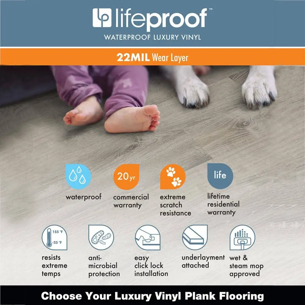 The Lifeproof Spring Park Oak 22 MIL x 8.7 in. W x 48 in. L Click Lock Waterproof Luxury Vinyl Plank Flooring offers a perfect combination of durability and style for any room. With its 22 MIL wear layer, it provides outstanding protection against everyday wear and tear. The waterproof design makes it an excellent choice for kitchens, bathrooms, and basements. The click-lock installation allows for a quick and easy DIY setup, while the 8.7-inch width and 48-inch length planks deliver a sleek, spacious look. Featuring a beautiful Spring Park Oak finish, this flooring adds a touch of natural elegance. Each case covers 20.1 sq. ft., and it’s also scratch and stain resistant, ensuring it stays looking great for years to come